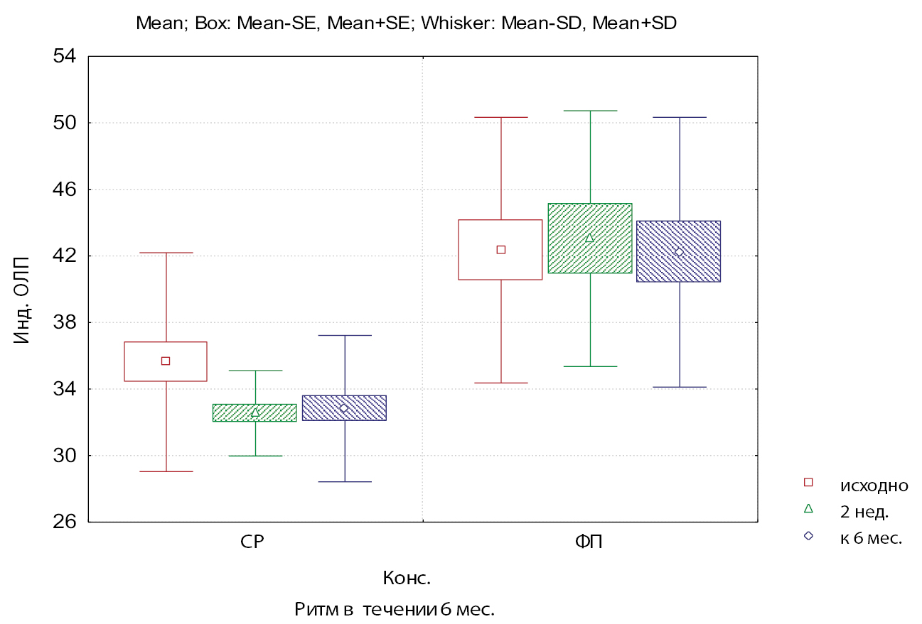 After 2 weeks of observation, patients after drug cardioversion showed a slight trend towards a decrease in the LAVI to 32.5 + 2.6 ml/m2 in the absence of arrhythmia recurrences during this period, without significant further dynamics (32.8 + 4.4 ml/m2 after 6 months; p > 0.05). In patients with AF recurrence within 6 months, this indicator did not change significantly in dynamics: by the 2nd week of observation, the LAVI was 43 + 8 ml/m2, by 6 months it was 42.2 + 8.1 ml/m2; p > 0.05 (Fig. 4).