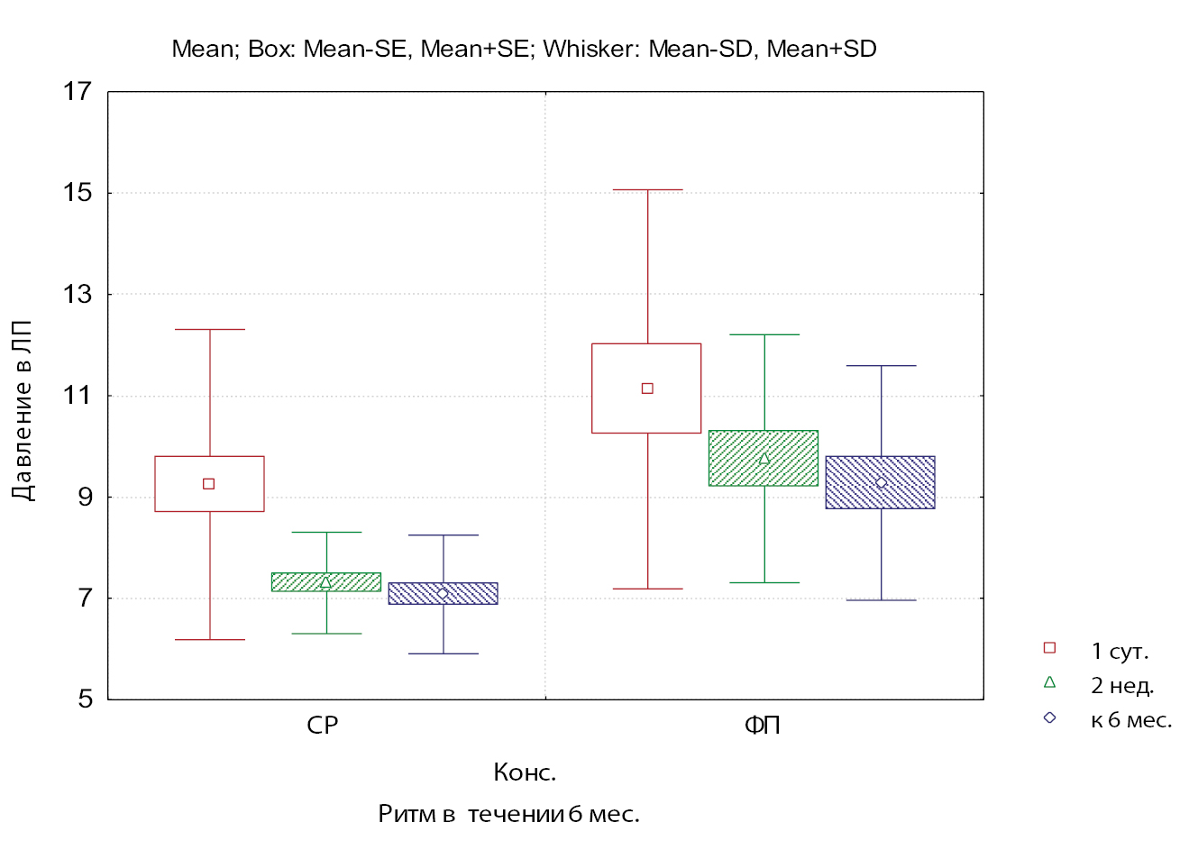 MATERIALS AND METHODS: 153 patients with non-valvular AF lasting from 24 hours to 6 months were examined. All patients were divided into 3 groups depending on the type of cardioversion: the 1st group included 49 patients whose CP was restored against the background of drug therapy; the 2nd group included 57 patients after electro-pulse therapy (EIT); the 3rd group included 47 patients who underwent radiofrequency isolation of the pulmonary veins (RFI LV). All patients underwent ECHO-cardiographic examination (ECHO KG) at the time of AF, as well as on 1, 3, 5, 15 days and 6 months after CP recovery with an assessment of indexed indicators of linear left atrium size (LP), LP volume, LP function recovery time by the rate of peak A transmittal flow (TMF) and LP filling pressure in relation to E/E’ with the help of a fabric Doppler imaging.