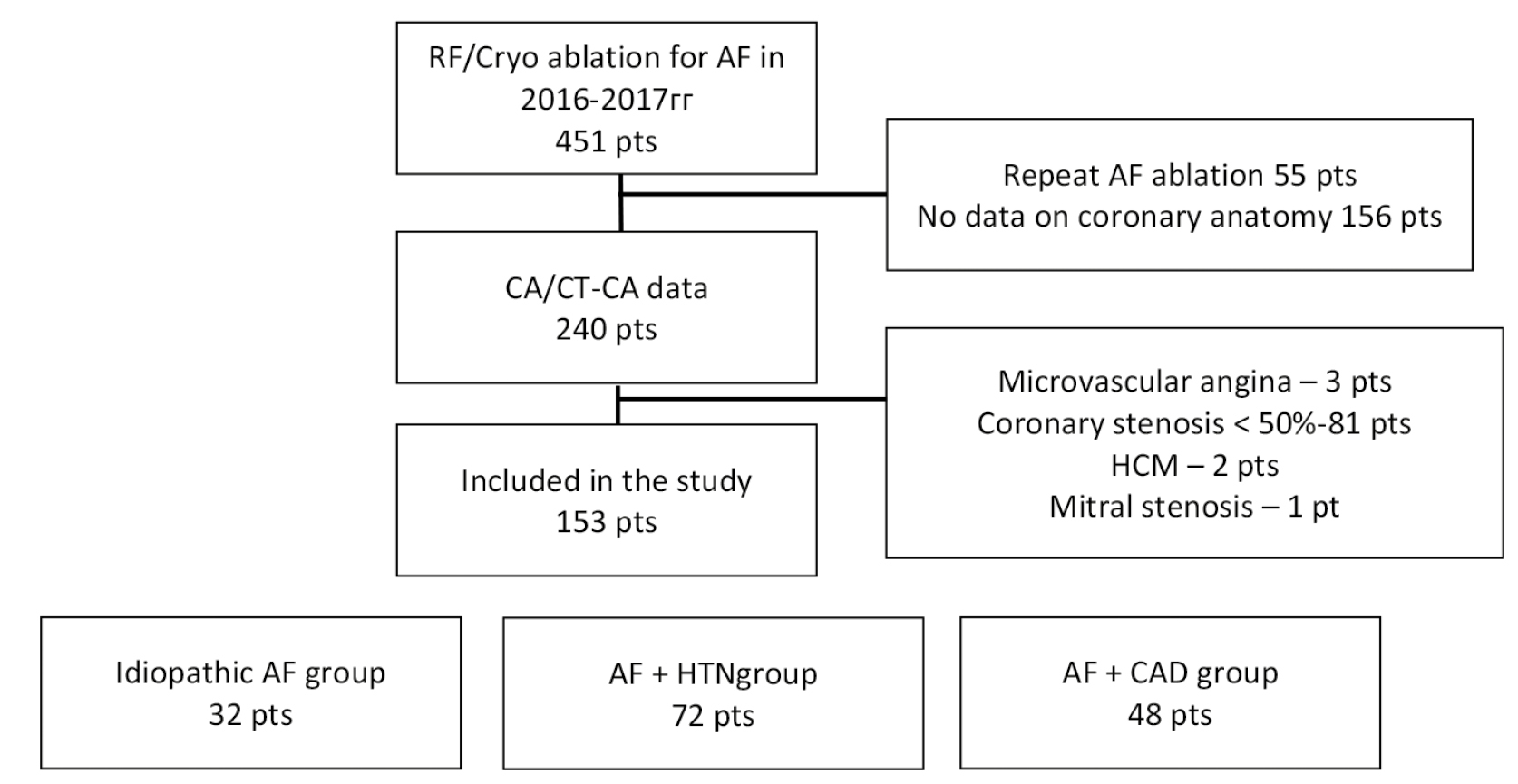 MATERIALS AND METHODS: Patients who underwent 451 PVI procedures performed since January 2016 to December 2017 were screened for AH, CAD and other structural heart disease. Among them 153 pts were selected for the subsequent analysis and divided into 3 groups — IdiopathicAF, AF + AH, AF + CAD.