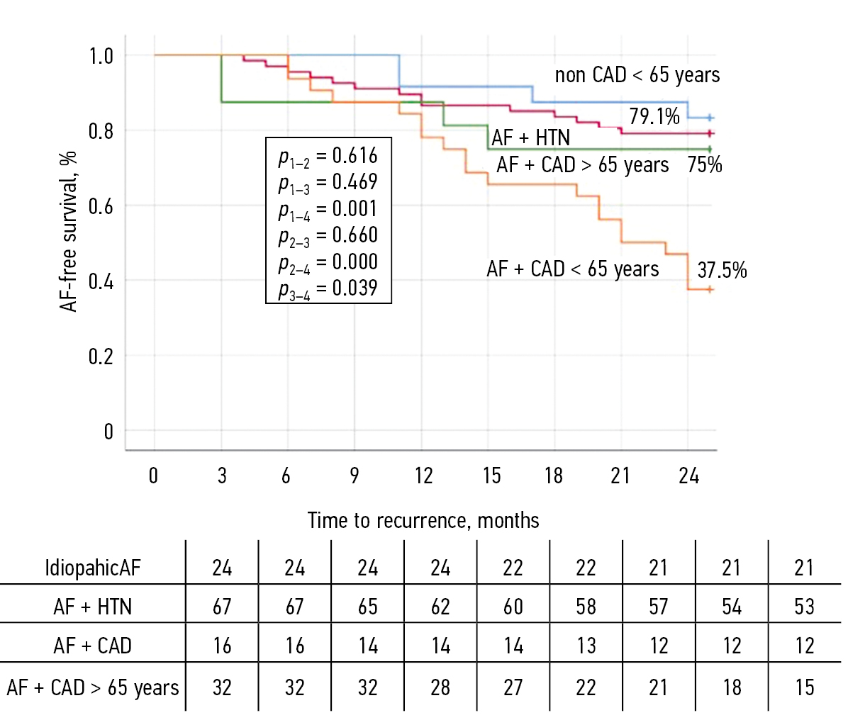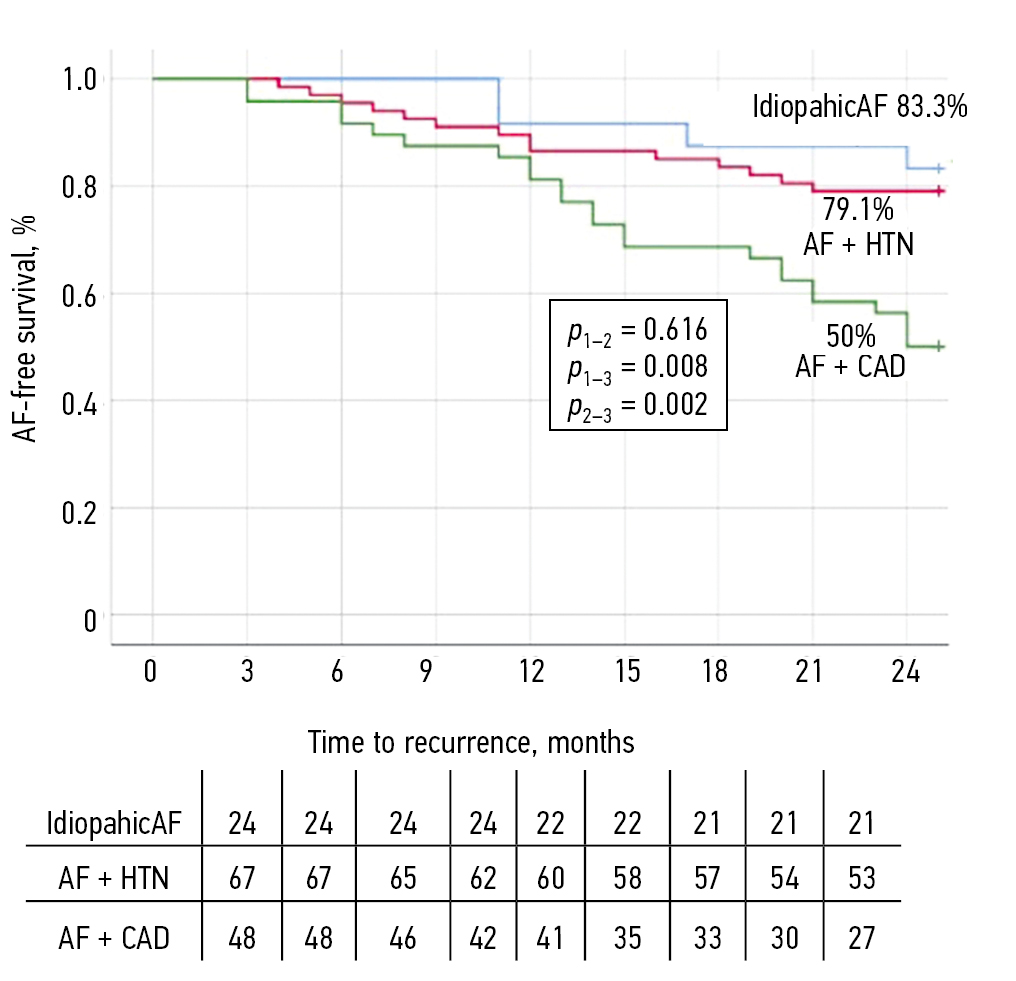 As shown at the Figure 2, the patients in AF + CAD group demonstrated significantly lower efficacy than in other clinical groups: 50% vs 83.3% (IdiopathicAF, log-rank p = 0.008) and 79.1% (AF + HTN, log-rank p = 0.002). The recurrence rate in the AF + HTN group did not differ from IdiopathicAF group (log-rank p = 0.616).