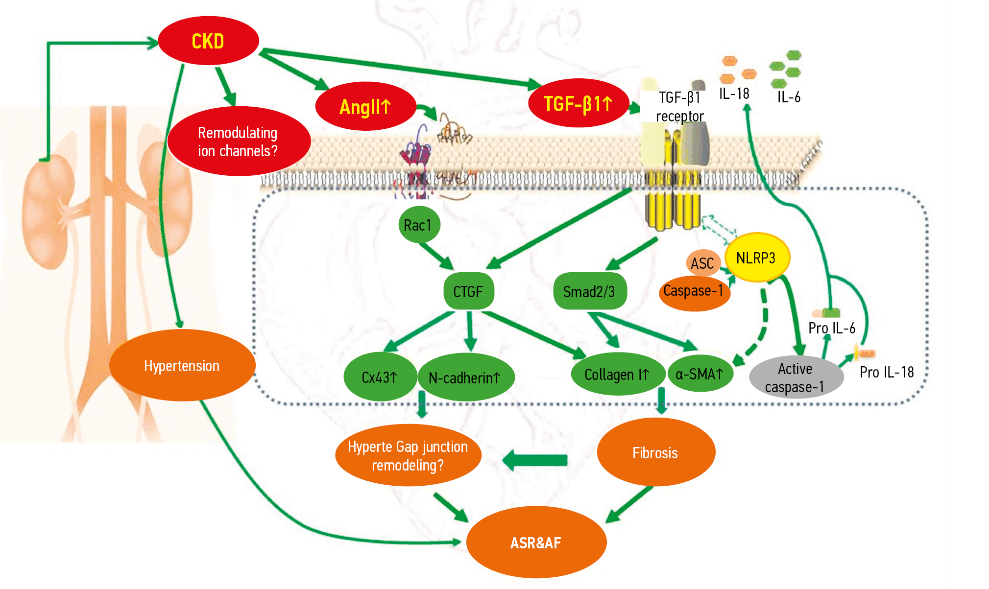 Fig. 1. Potential biological pathways involved in the formation of arrhythmogenic substrate of atrial fibrillation (AF) in chronic kidney disease (CKD). Atrial fibrosis induced by CKD may be associated with activation of the TGFβ1/Smads signaling pathway and NLRP3 inflammasome signaling pathway, and the CKD induced Cx40/43- gap junction remodeling may be connected with the Ang II-induced activation of Rac-1, CTGF and N-cadherin in atrial cells. Ang II — angiotensin II; ASC — apoptosis-associated Speck-like protein containing the C-terminal CARD domain; ASR — structural remodeling of the atria; α-SMA — α-smooth muscle actin; CTGF — connective tissue growth factor; Cx43 — connexin 43; IL-1β, -18 — interleukin-1β, -18; NLRP3 — NOD-like receptor (NLR) containing pyrin domain 3; Rac1 — intracellular protein involved in cellular signal transduction from a family of small G-proteins (small GTTases); TGF-β1 — transforming growth factor-β1 (adapted from [21])