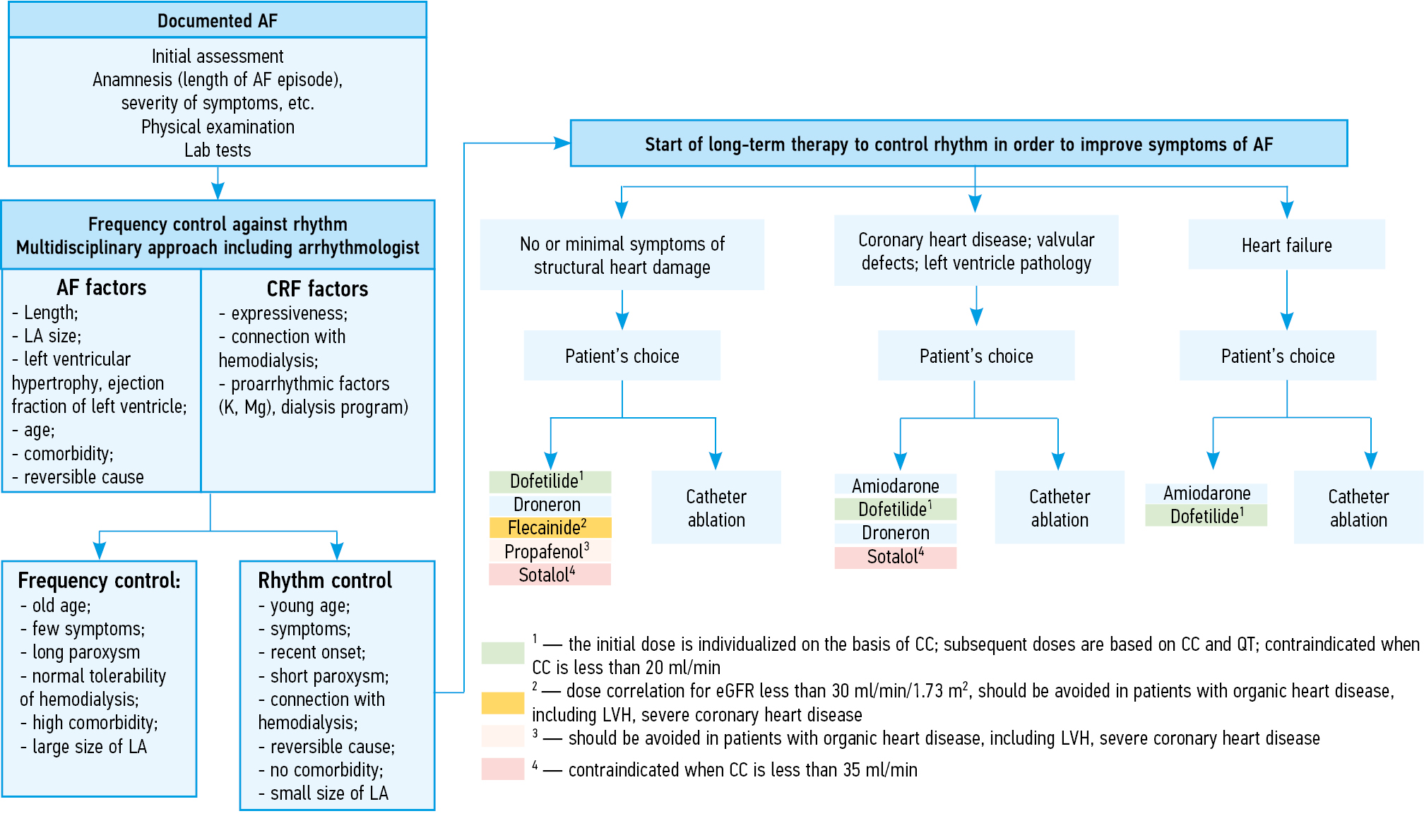 For the treatment of patients with AF and CKD, as well as patients with AF in the general population, two alternative therapeutic strategies are recommended: 1) rate control; 2) heart rythm control. Treatment is carried out in order to reduce the severity of AF symptoms, improve hemodynamic parameters, and prevent possible complications [2, 3, 6].