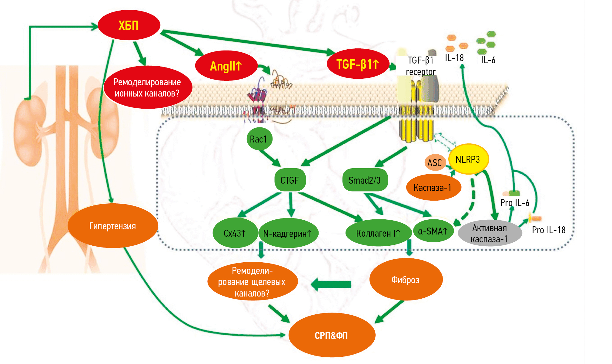 Renin-angiotensin-aldosterone system (RAAS). Activation of the RAAS and its mediators is a major factor in the pathogenesis and progression of CKD [7]. Angiotensin II (AngII) has profibrotic activity. AII in combination with aldosterone promotes the production of reactive oxygen species by activating nicotinamide adenine dinucleotide phosphate (NADPH) oxidase, which in turn stimulates the production of transforming growth factor β1 (TGF-β1). In general, the RAAS, with the help of its mediators, initiates oxidative stress and the synthesis of profibrotic growth factors, the production of pro-inflammatory cytokines, cell adhesion molecules, extracellular matrix proteins, plasminogen activator inhibitor-1 (PAI-1), promotes the activation of macrophages [7]. RAAS activation is seen as an important link between CKD and AF. In the formation of an arrhythmogenic substrate in the heart in AF, three interrelated pathways are believed to be involved ― RAAS, TGF-β1 and oxidative stress; the atria appear to be more susceptible to fibrosis than the ventricles [7, 19]. In a transgenic mouse model overexpressing the constitutively active form of TGF-β1, selective atrial fibrosis was observed, which led to heterogeneous conduction and increased atrial vulnerability to AF [20]. RAAS can also induce the activation of the TGF-β1/Smad2/3 pathway, which is also promoted by an increased level of reactive oxygen species and oxidative stress [21]. An experimental decrease in TGF-β1 expression with pirfenidone reduces the degree of fibrosis in the lungs, liver, kidneys, and heart [7]. A study in nephrectomy rats, which are used to model the pathogenesis of human CKD, demonstrates the role of oxidative stress mediated by NADPH oxidases in causing left atrial fibrosis and increased vulnerability to AF. Treatment with a powerful antioxidant, zinc sodium dihydrolipoyl histidinate, was effective in reducing the inducibility of AF [7, 22].