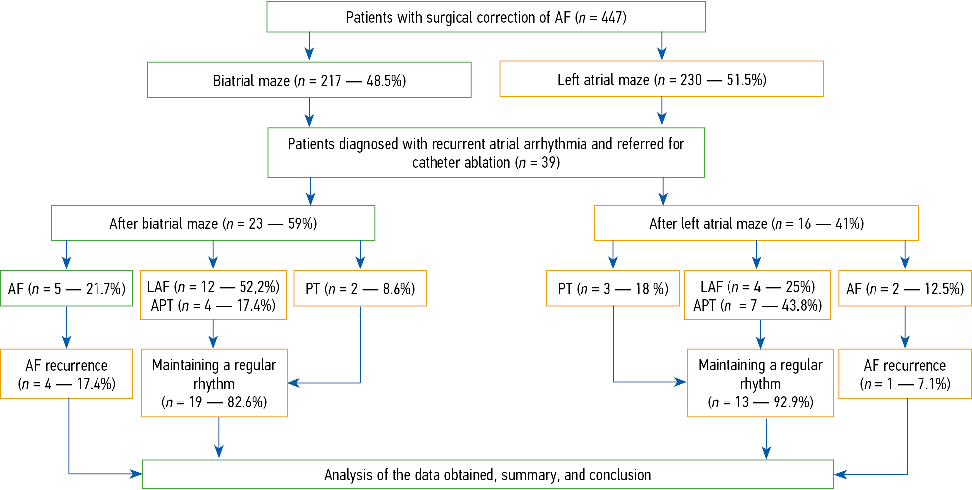 Несмотря на то, что фибрилляция предсердий (ФП) не относится к жизнеугрожающим аритмиям, негативную составляющую этой предсердной аритмии трудно переоценить: эмболические осложнения, развитие структурной патологии сердца и увеличение смертности от всех причин [1]. Современные метаанализы определяют, что биатриальная аблация способствует длительной свободе от рецидива ФП и может быть показана пациентам с длительно персистирующей формой [2–4]. Кроме восстановления и удержания регулярного предсердного ритма хирургическая аблация демонстрирует более высокие психологические и физические компоненты качества жизни пациентов в сравнении с другими вариантами аблации ФП [5]. Несмотря на практически радикальное устранение основных механизмов, поддерживающих ФП с помощью открытого оперативного лечения с использованием классической процедуры лабиринт-3, у части пациентов диагностируются клинически значимые рецидивы нарушений ритма, требующие дополнительных катетерных процедур [4, 6–12]. Появившееся в последнее десятилетие понятие «гибридный подход к лечению ФП» подразумевает возможность проведения следующего эндокардиального этапа (или этапов) после хирургических операций по устранению ФП или имплантацию устройств для контроля частоты ритма [13–16]. При проведении эндокардиального этапа можно верифицировать аритмию, определить наличие рубцовых полей в структуре предсердий, а также параметры низкоамплитудных участков [17]. Именно от этих значимо различающихся по структуре зон в миокарде, их протяженности и локализации зависит вероятность удерживания регулярного ритма предсердий и восстановления систолического вклада предсердий в кинетику миокарда. В статье представлены анализ отдаленных результатов по критерию удерживания регулярного предсердного ритма после двух вариантов хирургической коррекции ФП и оценка эффективности выполненного последующего эндокардиального этапа аблации.