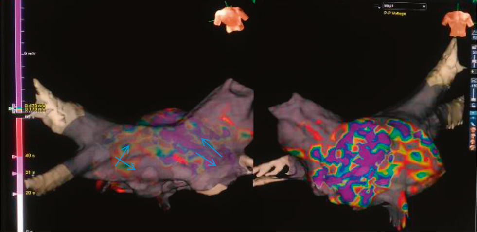 После катетеризации коронарного синуса для оценки вида предсердной аритмии оценивалась регулярность цикла тахиаритмии, его длительность, распространение фронта активации аритмии. Затем выполнялась оценка наличия проведения в легочных венах, состоятельность изоляции задней стенки ЛП, анализ выраженности и количества низкоамплитудных зон в предсердиях. Низкой амплитудой с электрода по коронарному синусу считали амплитуду регистрируемого сигнала менее или равную 0,2 мВ. При выявлении аритмии с регулярным циклом трепетания предсердий проводилась дифференциальная диагностика полости субстрата трепетания (право- или левопредсердное трепетание). Уточнение вида трепетания выполнялось по критериям анализа фронта активации и определения вовлечения нахождения лечебного электрода относительно цикла аритмии. В случае выявления левопредсердного трепетания дальнейшая методика ЭФИ и аблации была сходной тактике при ФП. Дважды проводилась пункция межпредсердной перегородки интродьюсерами «Preface Multipurpose» (Cordis, США) под рентгенконтролем. Затем выполняли трехмерную эндокардиальную реконструкцию левого или правого предсердий, амплитудную карту для выявления рубцовых областей в левом и правом предсердии (рис. 2) и активационное картирование с окном интереса на 10–20 мс меньше цикла тахикардии. При трепетании предсердий аблация проводилась по выявленным критическим зонам проведения с созданием и обязательным контролем наличия двунаправленного блока проведения (не менее 140 мс). Также в качестве критериев формирования блока проведения при трепетаниях предсердий рассматривали эпизод формирования «двойных» спайков и резкого удлинения проведения сигнала по данным эндограммы на лечебном электроде.