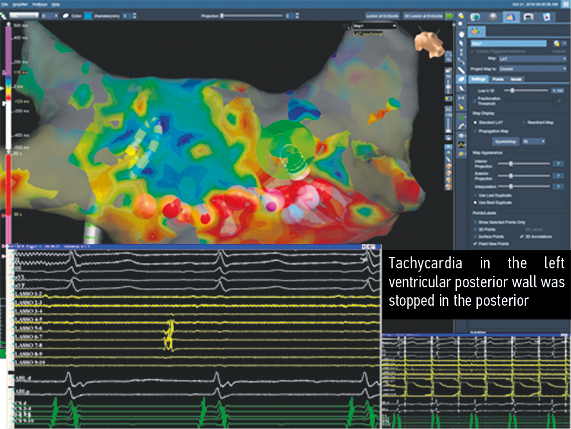 Fig. 4. Relief of tachycardia in the posterior anastomosis on the right. Top–down: amplitude map of the patient, standard leads of the electrocardiogram, and signals from the multipole circular electrode (yellow) on the posterior wall of the left atrium. The arrows indicate the absence of activity from the anastomosis on the right, where the treatment electrode is located. White, signals from the ablation electrode; green, signals from the multipole electrode in the coronary sinus. The Claris EPT system (Abbott, USA) was used. The recording speed was 200 mm/s