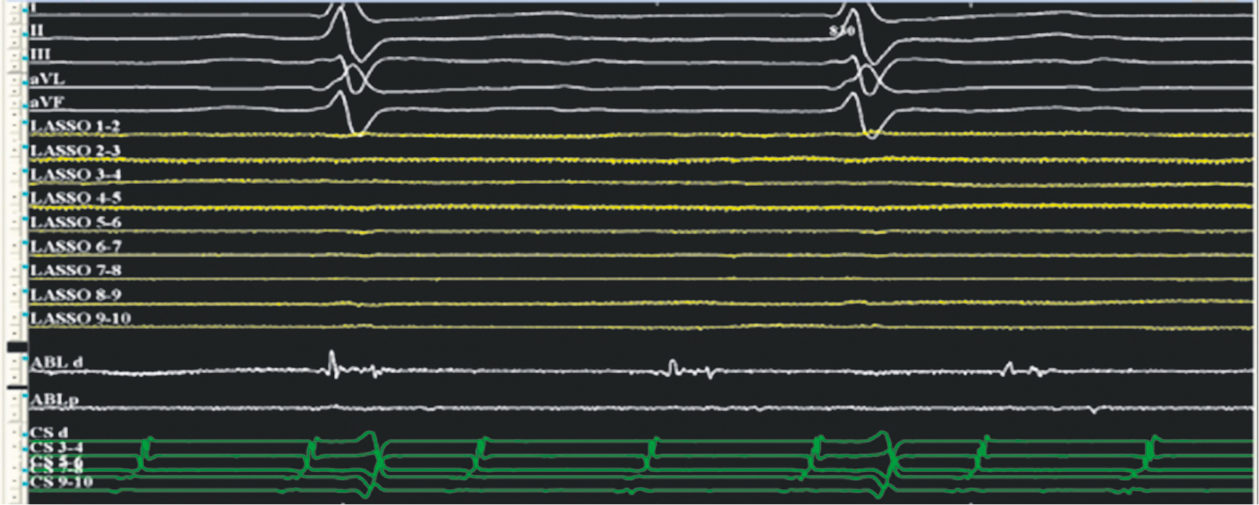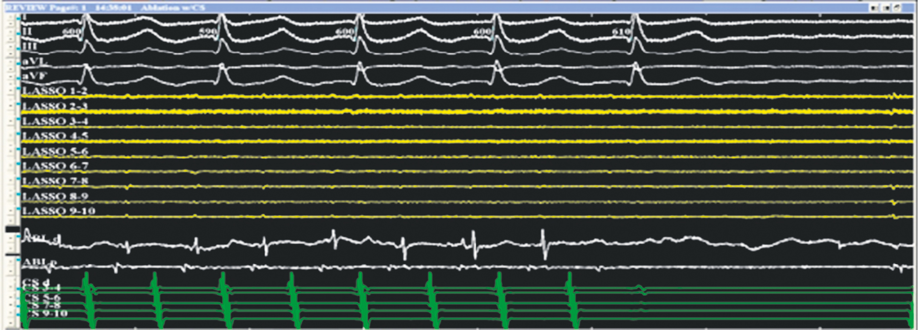 Fig. 7. Atrial flutter in a patient after labyrinth-3 surgery. Top–down: standard electrocardiogram leads, signals from a multipole circular electrode on the left atrial posterior wall (yellow), signals from the ablation electrode (white), ablation electrode located on a partially isolated site of the atrial myocardium, and signals from the multipole electrode in the coronary sinus (green). The EPT system “Claris” (Abbott, USA) was used. The recording speed was 200 mm/s