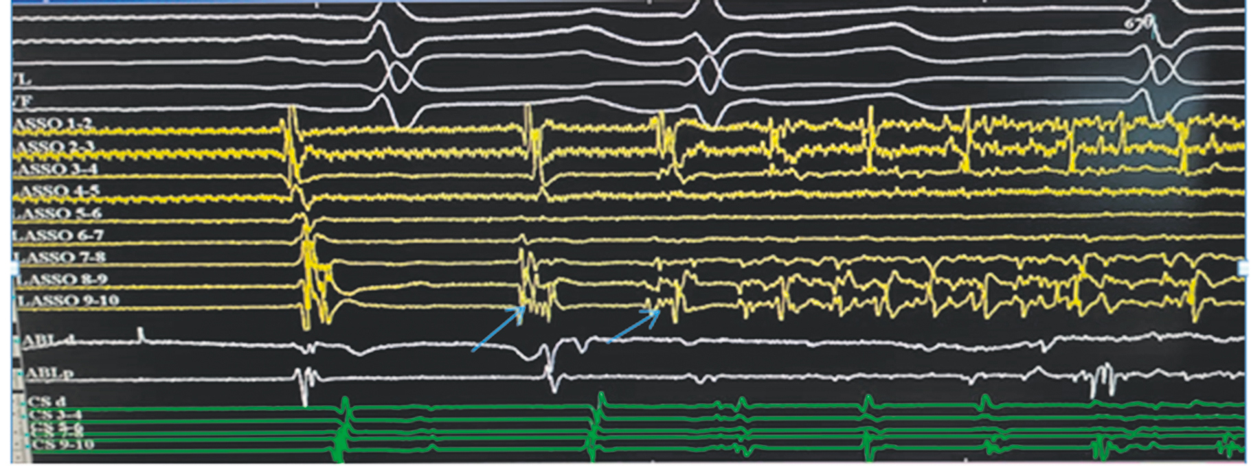 Рис. 6. Повторная индукция фибрилляции предсердий после кардиоверсии. Стрелками указан старт фибрилляции предсердий через несколько синусовых комплексов сразу после проведения кардиоверсии. Сверху вниз: стандартные отведения электрокардиограммы, сигналы с многополюсного циркулярного катетера «Lasso» расположенном в верхней полой вене (желтые эндограммы) — запуск с одиночной эктопии (самый ранний сигнал во время запуска аритмии) и трансформация в неритмичную фибрилляторную активность (также указание стрелкой), сигналы с аблационного электрода (белые), сигналы с многополюсного электрода в коронарном синусе (зеленые). ЭФИ-система «Claris» (Abbot). Скорость записи 200 мм/с