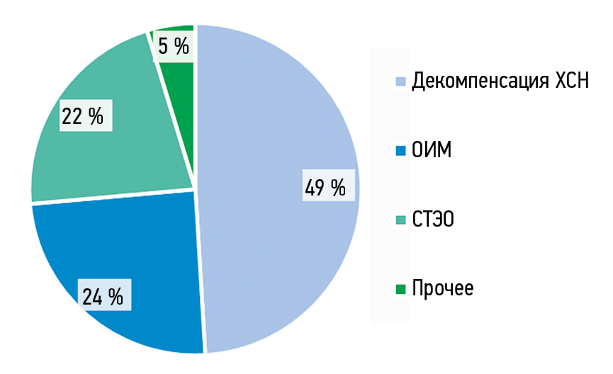 Рис. 1. Основные причины смерти пациентов с ФП в отдаленные сроки, выписанных из отделения сердечно-сосудистой хирургии № 1 (ангиохирургии) СЗГМУ им. И. И. Мечникова после лечения по поводу эмбологенной артериальной непроходимости. ОИМ — острый инфаркт миокарда; СТЭО — системные тромбоэмболические осложнения; ФП — фибрилляция предсердий; ХСН — хроническая сердечная недостаточность