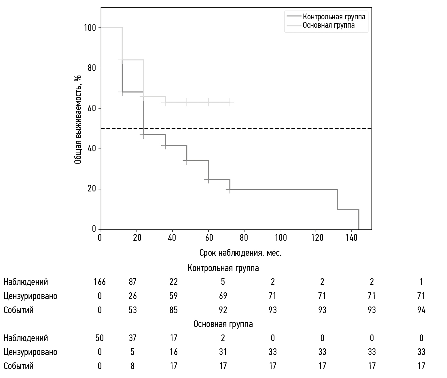 Анализ показал, что 75-й процентиль продолжительности жизни в КГ составил 12 [12–12] мес. от начала наблюдения, медиана — 24 [24–48] мес., а 25-й процентиль — 60 [48–144] мес. В ОГ 75-й процентиль продолжительности жизни составил 24 [12 — ∞] мес., а медиана и 25-й процентиль за весь срок наблюдения не были достигнуты (см. рис. 2). Различия общей выживаемости, оцененные с помощью теста отношения правдоподобия, были статистически значимы (p = 0,001).