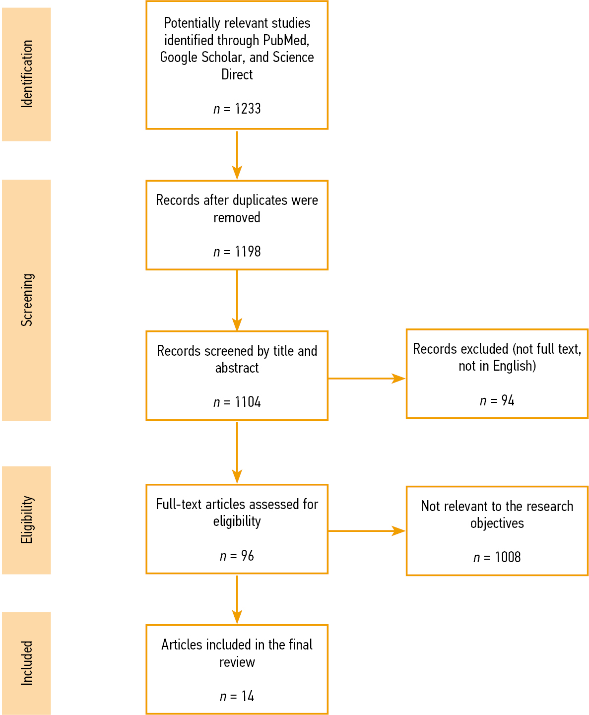 An extensive electronic search was conducted using search engines such as Google Scholar, ScienceDirect, and PubMed. The search was limited to English-language articles published between 2014 and 2023 using “cardiac implantable electronic device” AND “tricuspid regurgitation” as the keywords. The search results included reviews, original papers, and case reports. Articles with restricted access and those authored in languages other than English were excluded. The extracted articles were managed using the Mendeley software. After arranging the search results based on the titles and abstracts, the full texts of the publications were examined, and those that matched the exclusion criteria were eliminated. A total of 1.233 articles were retrieved through the search strategy, and 14 articles met the criteria. The literature search process is shown in Figure 1.