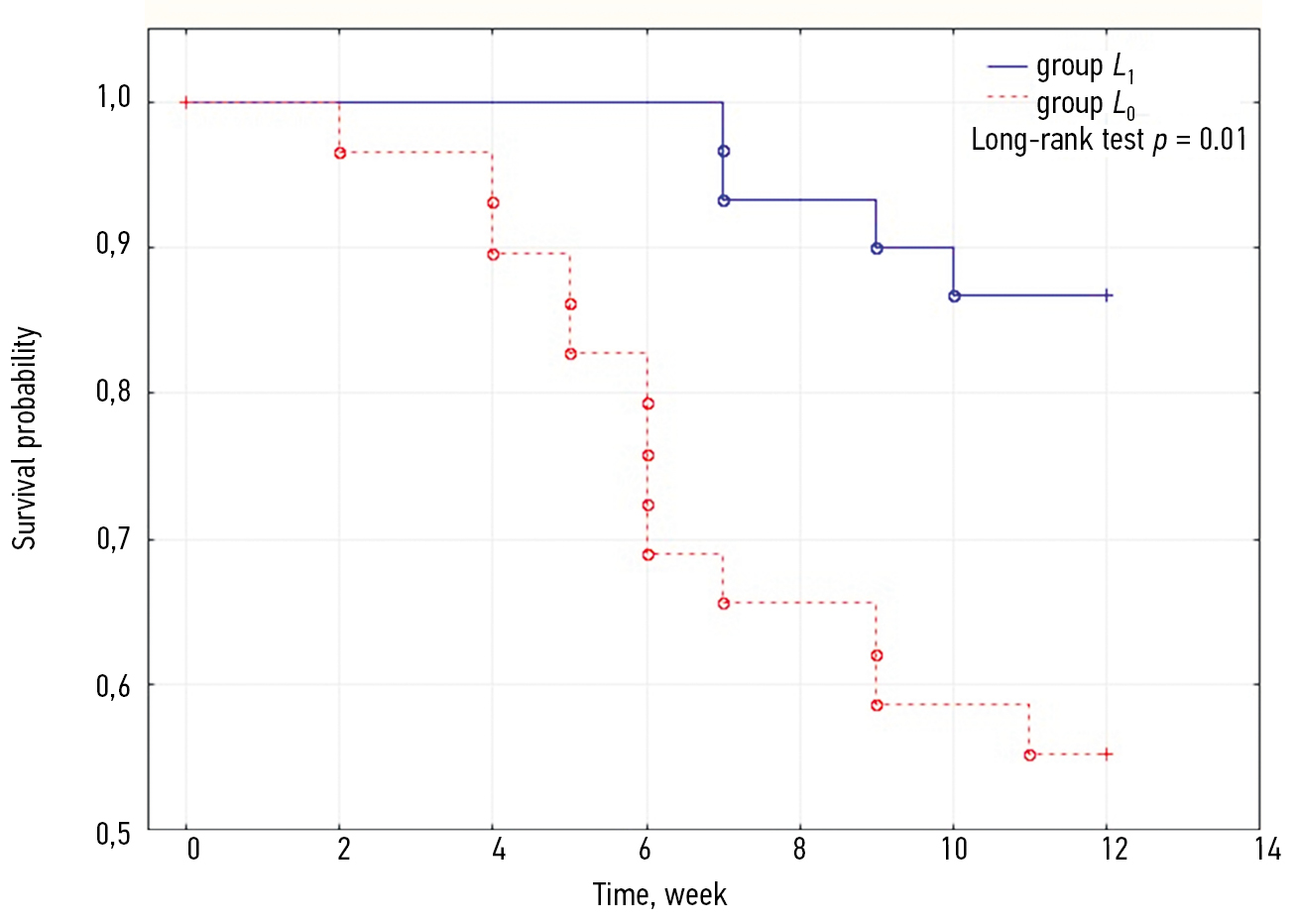 The median period of freedom from AF after cardioversion in the sample patients was 12 (9; 12) weeks. AF recurred in 4 (13%) patients of the L1 group and 13 (43%) of the L0 group (p = 0.01). All cases were controlled by amiodarone drug cardioversion. A greater frequency of paroxysms with disrupted rhythm was observed in the L0 group in comparison with the L1 group (p = 0.03). In the L1 group, 13% of patients had recurrent AF up to once in 3 months. In the L0 group, 27% of the patients had AF recurrence up to once in 2 months, whereas the L1 group maintained sinus rhythm. Monthly AF recurrence was observed only in 7% of patients in the L0 group. The Kaplan – Meier analysis of freedom from recurrence in the L1 and L0 groups is presented in Figure 1. Cox regression analysis identified levocarnitine intake as the only statistically significant protective factor against AF recurrence (p = 0.008). In addition to the aforementioned predictors and protectors of freedom from AF, other variables were also included in the range of analyzed predictors. However, these variables were found to be statistically insignificant. These included the sex (p = 0.05) and age (p = 0.54) of the patients, presence of AH (p = 0.66), CHD (p = 0.21), CHF (p = 0.16), diabetes mellitus (p = 0.45), history of stroke (p = 0.98), BMI (p = 0.35), LVEF (p = 0.85), and LA size (p = 0.31).