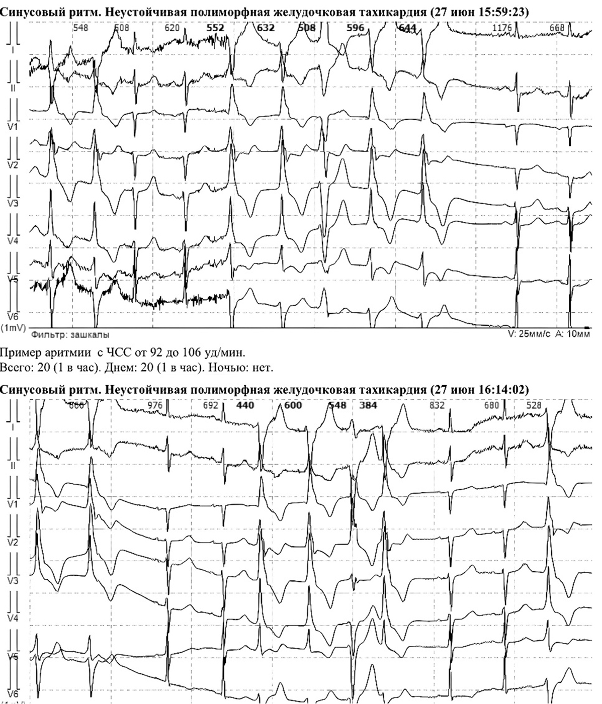 Рис. 2. Эпизоды неустойчивой полиморфной желудочковой тахикардии по данным суточного мониторирования электрокардиограммы от 27.06.2023