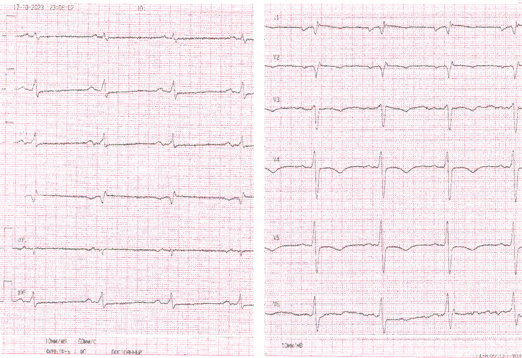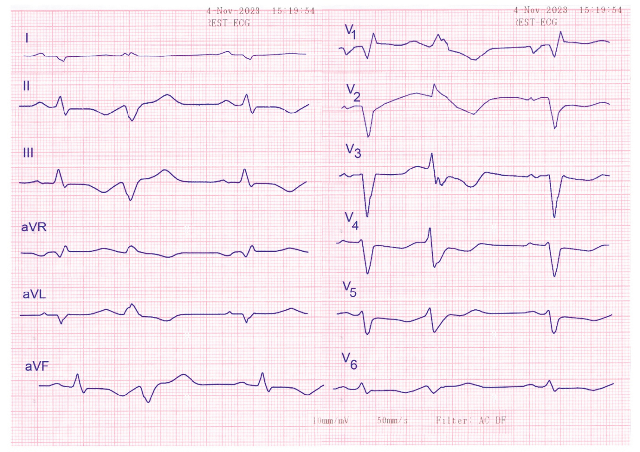 In October 2023, the patient was readmitted to Saint Petersburg City Pokrovskaya Hospital because of an atypical pain in the precordial region and frequent VT paroxysms, occurring 3–4 times per day. On October 17, 2023, ECG exhibited alterations identical to those observed in the January 2023 (Fig. 1).
