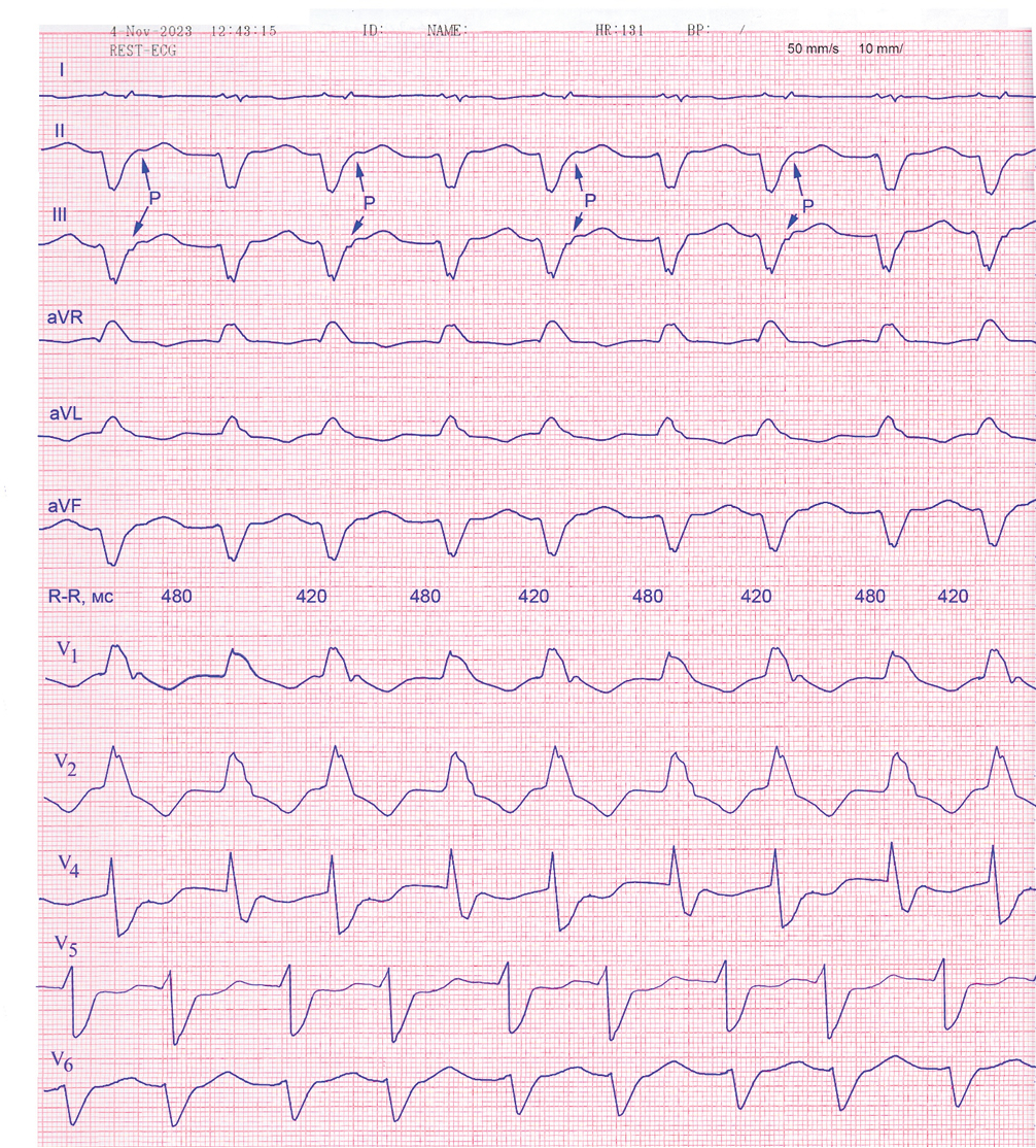 Two distinct types of VT were identified during the course of the patient’s hospital stay. The morphology of the complexes in both cases was practically identical, and the shape of the QRS complexes fully coincided with the description of VT from January 2023. Specifically, the shape was that of a complete RBBB and LAFB with a QRS width of 150 ms. When analyzing the ECG of type 1 VT, with a frequency of 131 bpm (Fig. 2), attention was drawn to the strictly regular alternation of two identical RR intervals (420 and 480 ms) and negative oscillations in the lower leads after the short R-R interval. The first impression of duplicated VT seemed unlikely, as this variant could involve two independent ventricular sources of automaticity operating simultaneously, both at excessively low and similar frequencies (~60 and 75 bpm). The presence of reciprocal LV VT was more probable, with two channels of impulse propagation, similar to the figure of eight configuration, in which the conduction time through one of the channels is longer than that through the other channel, with retrograde conduction of the impulses to the atria in a ratio of 2:1.