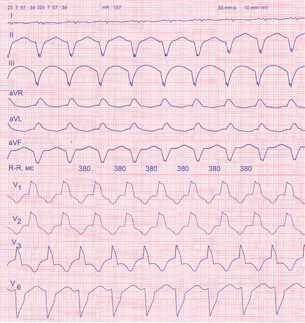 Since hospitalization day 1, recurrent episodes of VT accompanied by a decline in blood pressure were observed. The ventricular nature of the arrhythmia was unquestionable. VT was diagnosed using the criteria by Vereckei A. et al. [8]: a QRS complex type R in the aVR lead and a Vi/Vt ratio ≤1 (Vi, rate of voltage change during the first 40 ms of the QRS complex; Vt, rate of voltage change during the last 40 ms of the QRS complex).