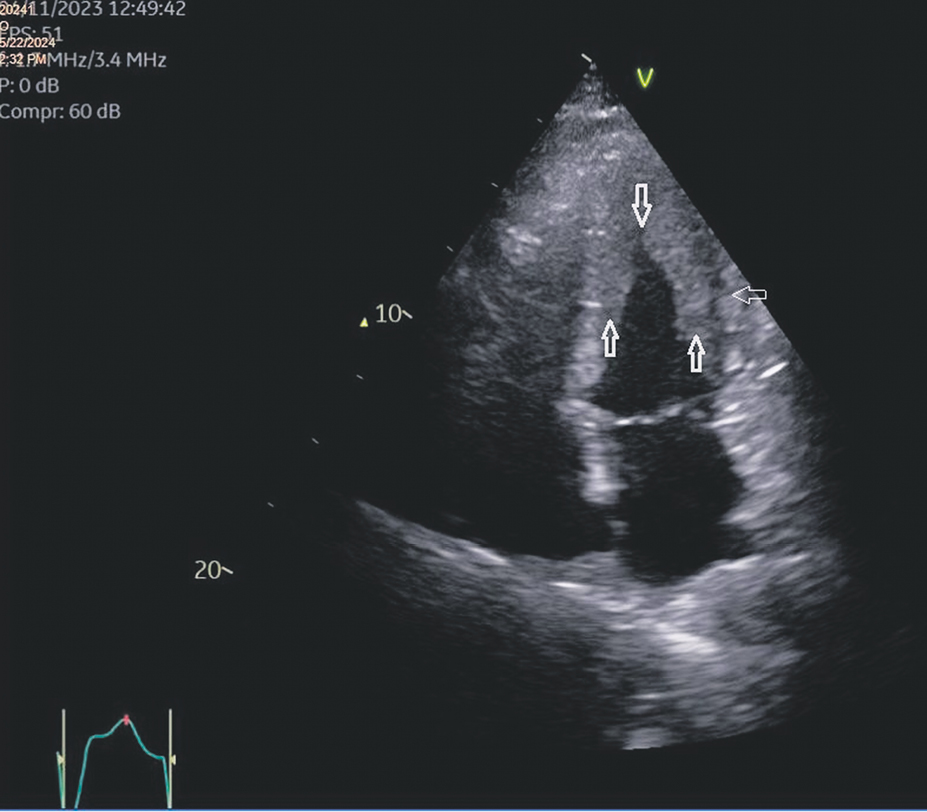 Fig. 5. Echocardiogram of Loeffler endomyocarditis of the LV. Four-chamber view, apical approach. The arrows indicate wall masses in the area of the akinetic apex and in the projection of myocardium with preserved local contractility. The border between the myocardium and myocardial projections is clearly visible. The wall masses and myocardium have different densities, and there is an obvious boundary between them. Vertical arrows indicate extensive wall masses initially believed to be thrombus; horizontal arrow indicates LV myocardium