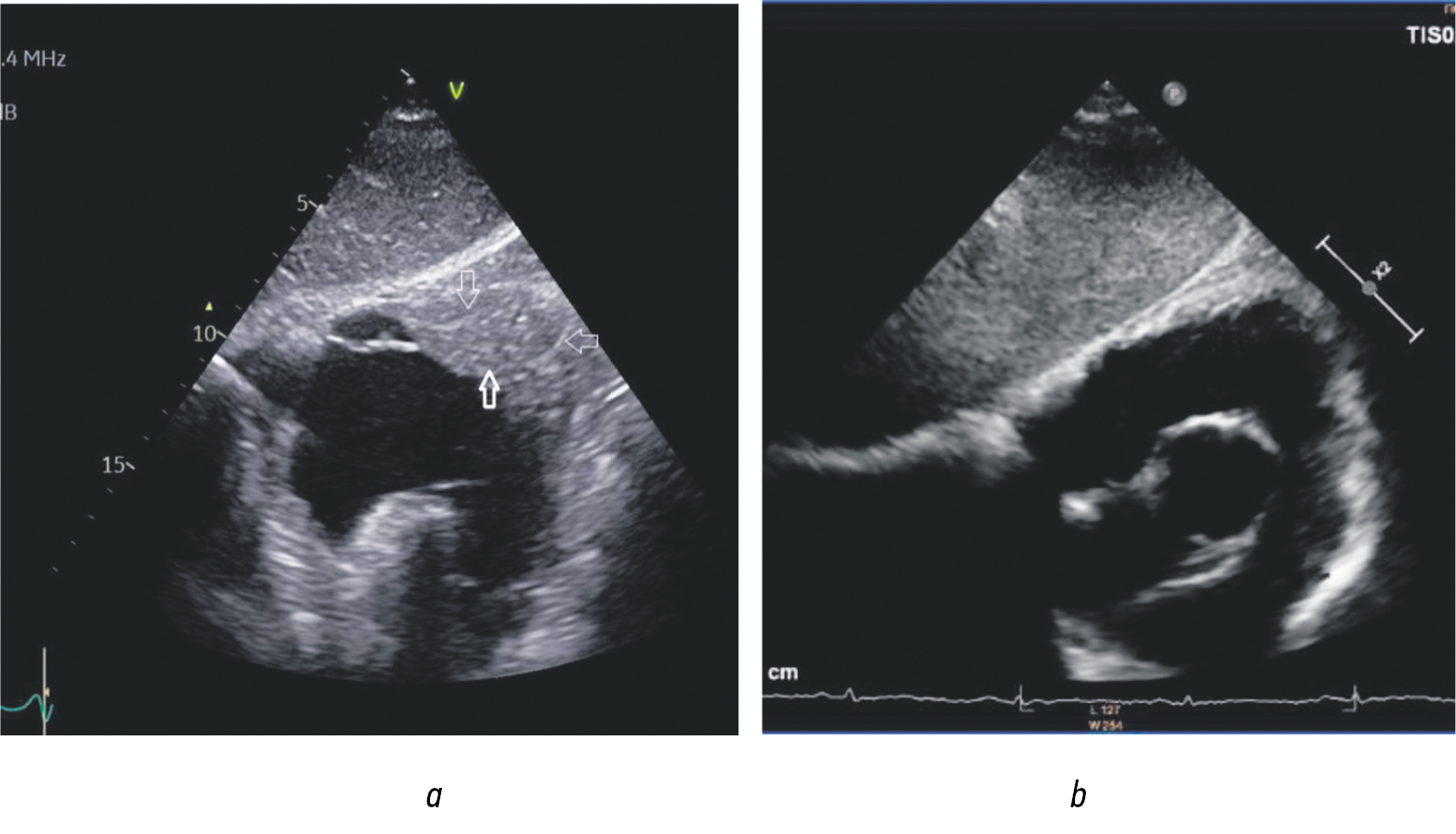 Fig. 6. Echocardiographic changes in the right ventricular outflow tract: a — short-axis view at the level of the aortic valve, subcostal approach, reveals parietal masses located in the outflow tract of the right ventricle, indicated by the lower arrow. The arrows above and to the right delineate the myocardium of the right ventricle and a clear boundary between the myocardium and the parietal deposits. For comparison; panel b — displays the same section from a healthy individual,demonstrating a non-thickened right ventricular myocardium absent of pathological parietal masses