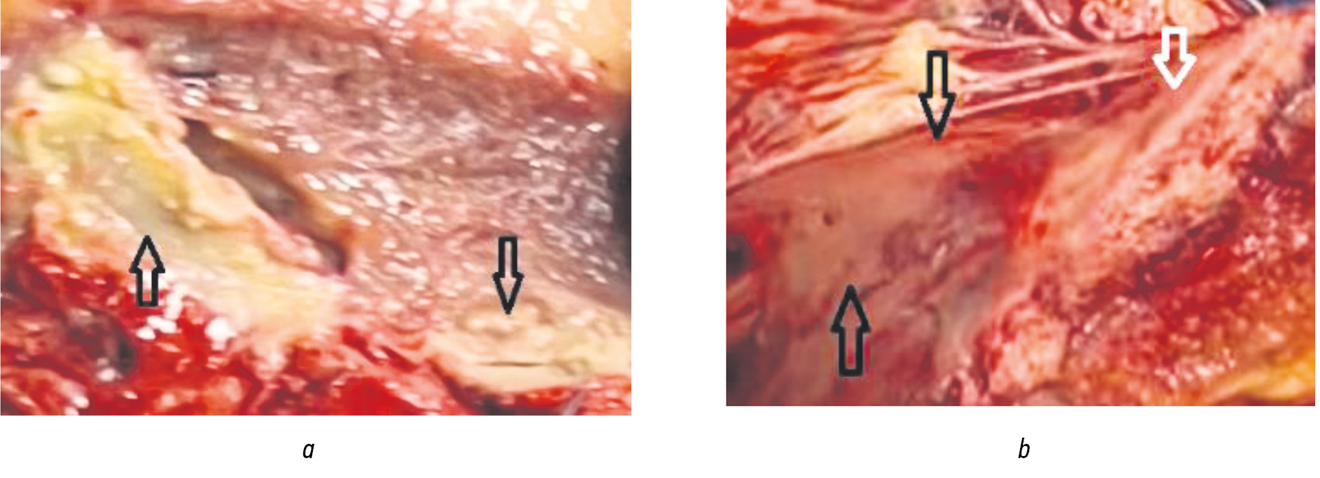 Fig. 7. Macroscopic sections in the LV apex: а — two adjacent foci of necrosis of pale yellow color (black arrows); b — thickened, inflamed endocardium of pale pink color. Intact endocardial areas are marked with black arrows and damaged areas with white arrows