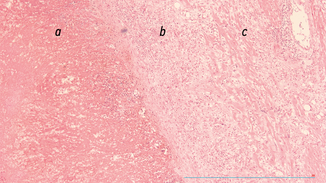 Fig. 8. Histological section of the endocardium and adjacent myocardium: a — endocardium; b — focus of necrosis; c — myocardium. At the border of the endocardium and myocardium, signs of necrosis of both endocardium and adjacent myocardium are noted. In the zone of endocardial necrosis, the presence of necrotic tissue, fibrin, and hemolyzed blood elements is observed. In the adjacent myocardium, similar changes are found: signs of necrosis, overgrowth of granulation tissue, and massive infiltration of the whole area with lymphocytes, plasmocytes, and eosinophils
