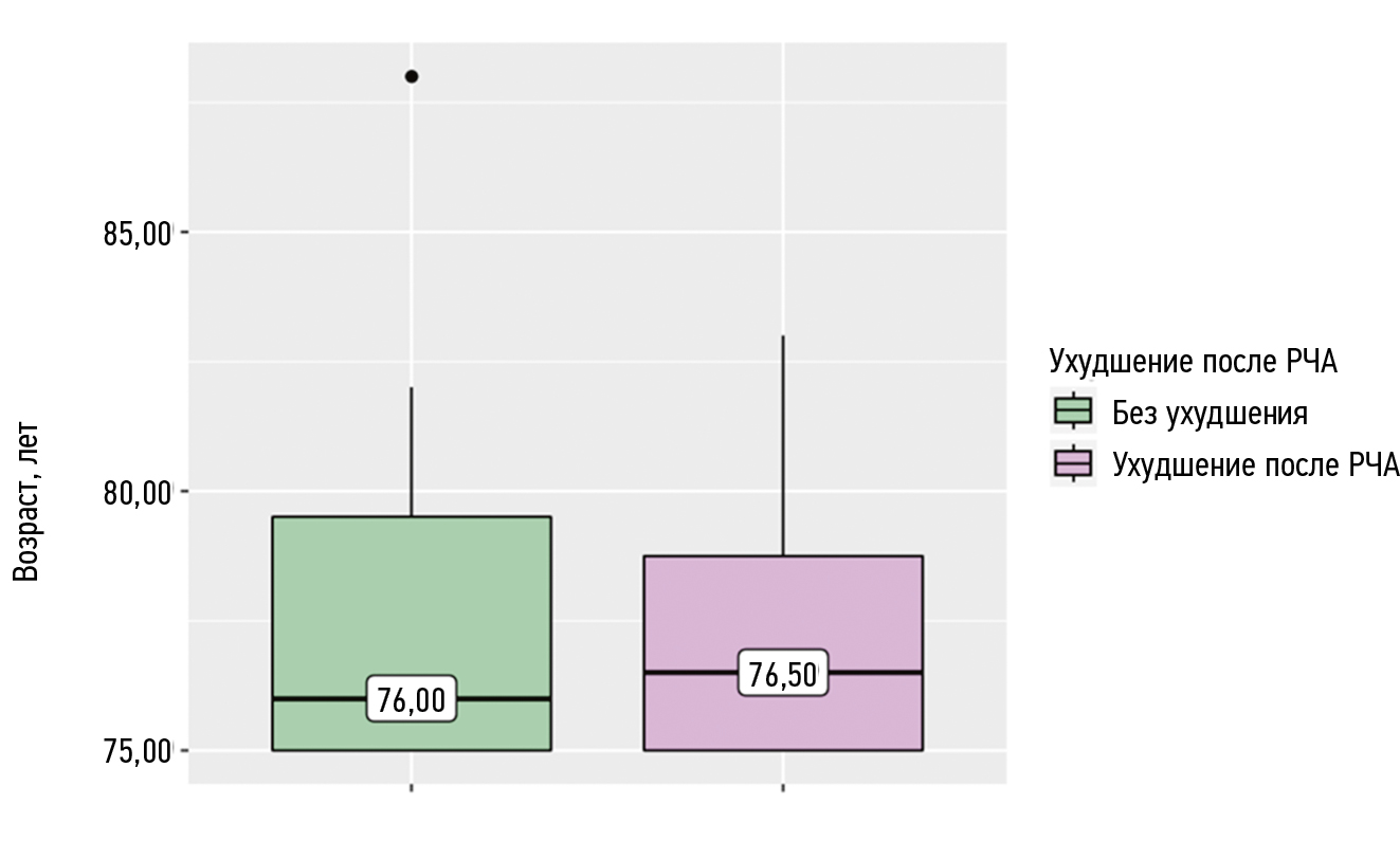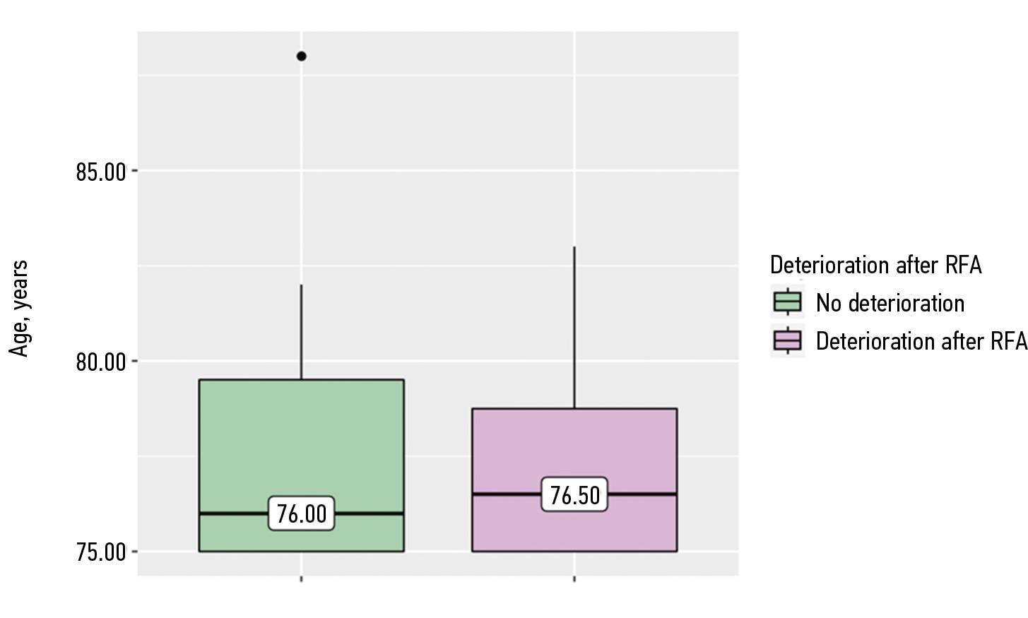 Fig. 1. Analysis of the impact of age on deterioration of condition in the long term after radiofrequency ablation of the pulmonary vein ostia (p = 0.971). The median value is shown in the center of the box plot; the box represents the interquartile range, and the ”whiskers“ indicate the full range of values.