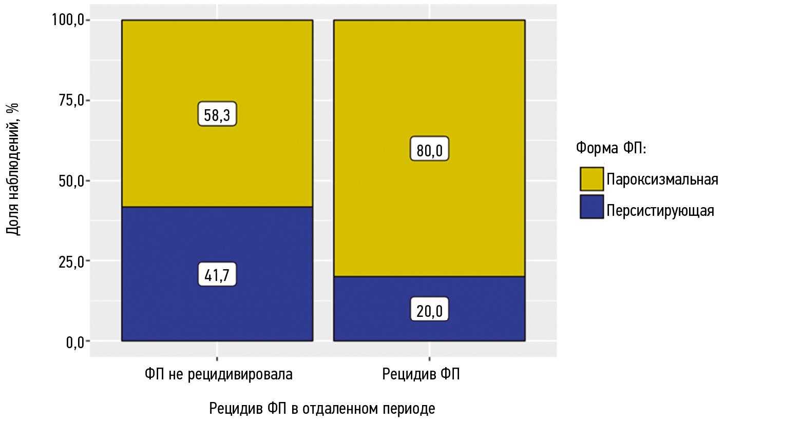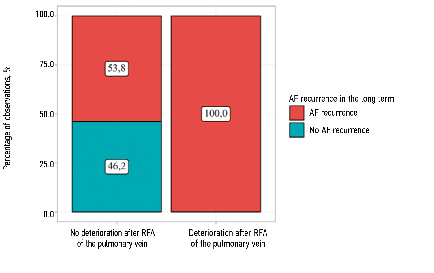 The main factor contributing to the deterioration of condition in the long term was AF recurrence. Despite the use of antiarrhythmic drugs, tachysystolic episodes significantly worsened quality of life and satisfaction with treatment outcomes. In patients whose condition deteriorated long after RFA of the pulmonary vein ostia, the frequency of AF recurrence was significantly higher (p = 0.007) (Fig. 2).