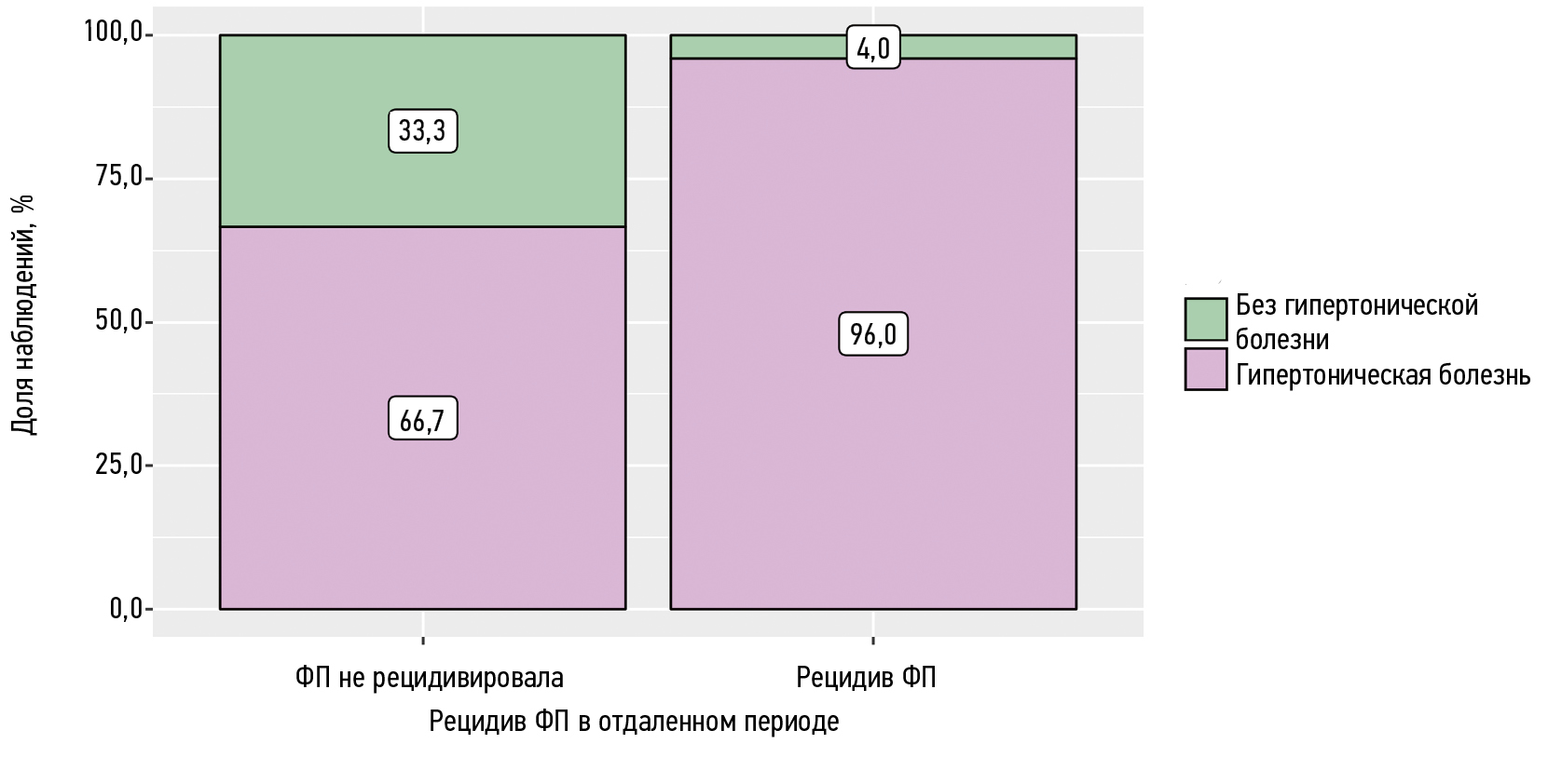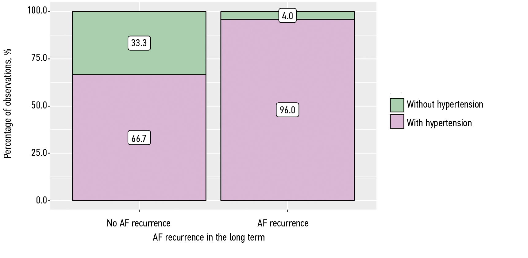 The key factors influencing AF recurrence were the presence of hypertension and LA size. The contribution of these two predictors to AF recurrence is not coincidental. One of the primary causes of LA dilation in patients with hypertension is chronic atrial pressure overload due to increased afterload on the LV. According to the published sources [8–10], baseline LA enlargement is one of the key predictors of recurrence after RFA of the pulmonary vein ostia. The studies have shown [11] that the risk of AF recurrence after RFA of the pulmonary vein ostia can increase by up to five times in the presence of LA dilation. Therefore, the feasibility of RFA of the pulmonary vein ostia in patients with LA dilation is questionable. It should be noted that if target blood pressure values are not achieved after RFA of the pulmonary vein ostia and hypertension persists, the risk of AF recurrence significantly increases.