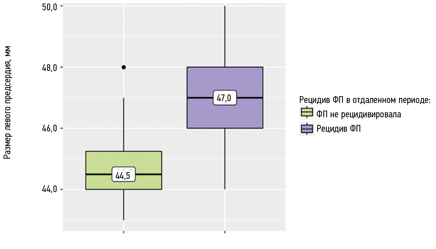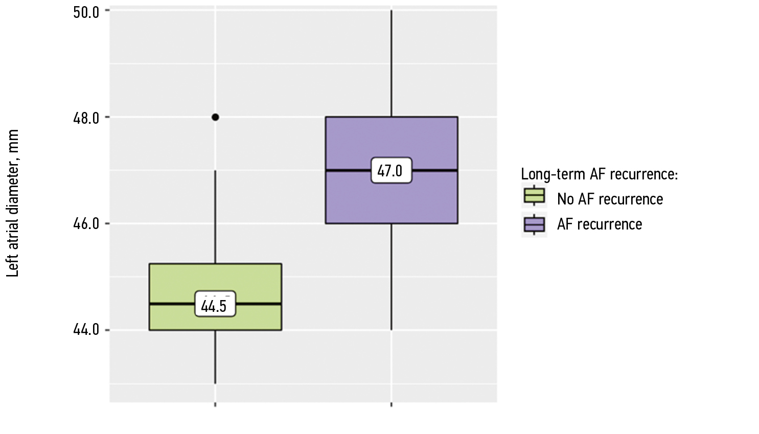 Fig. 5. Left atrial diameter according to transthoracic echocardiographic data in patients with and without atrial fibrillation recurrence (p = 0.001). The median value is shown in the center of the box plot; the box represents the interquartile range, and the ”whiskers“ indicate the full range of values.