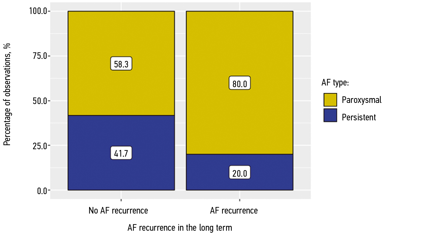 Fig. 3. Recurrence of atrial fibrillation in the study group during long-term follow-up after radiofrequency ablation of the pulmonary vein ostia, depending on the initial form of AF (p = 0.24).