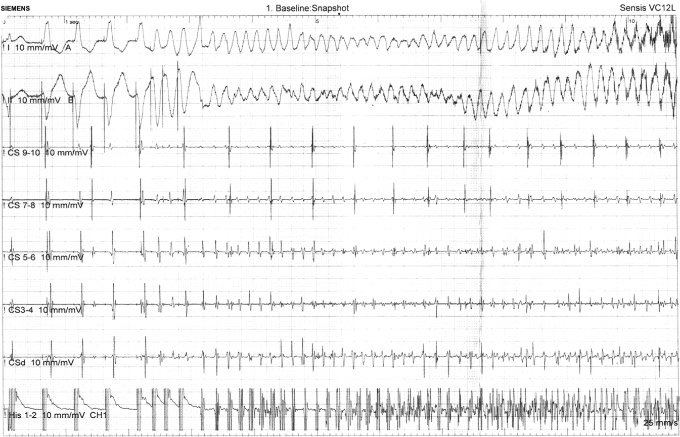 A 41-year-old woman (patient P.) was admitted to the cardiac surgery department with complaints of weakness, malaise, and anxiety. According to the patient, in 2013, at the age of 32, she experienced dizziness, and an examination revealed conduction disorders—second-degree AV block and second-degree SA block. That same year, a pacemaker was implanted. In 2016, pacemaker lead revision was performed due to lead displacement. In November 2021, following COVID-19, the patient experienced an episode of VT/VF, which was terminated by electrical cardioversion. TTE showed no valvular abnormalities, pacemaker leads were detected in the right heart chambers, and LVEF was 69%, indicating preserved left ventricular systolic function. ECG revealed sinus rhythm with a HR of 72 bpm, inverted T waves in leads V1–V4, and flattened T waves in leads V5–V6 (Fig. 6). Coronary angiography demonstrated intact coronary arteries. An EPS was performed: during programmed stimulation of the right ventricular apex with three extrastimuli without adrenaline (St1-St2-St3-500-240-150-240), an induced sustained VF episode occurred (Fig. 7), which was terminated by 150 J electrical cardioversion. Based on the EPS findings, the decision was made to replace the pacemaker with an ICD.