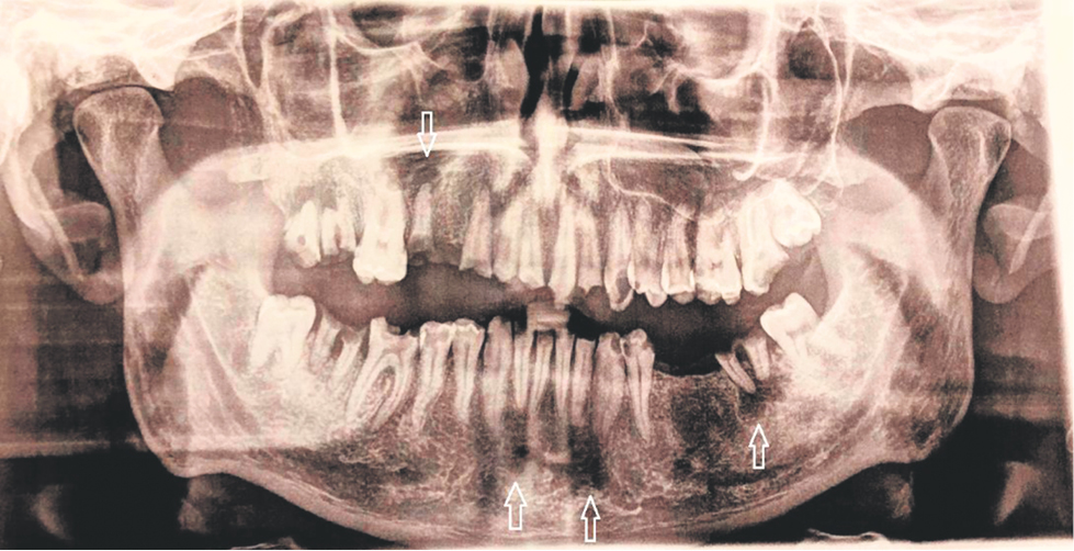 Fig. 1. Orthopantomogram of patient A. Arrows indicate multiple granulomas of the roots of the teeth of the upper and lower jaws.