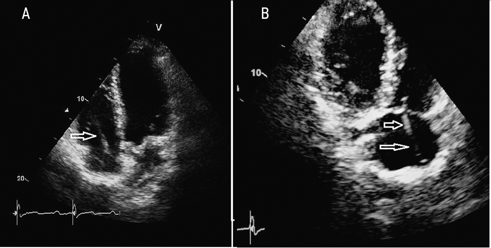 Fig. 2. Echocardiograms of patient A. Arrows indicate uneven compaction and thickening of the electrode sections located in the right chambers of the heart. Reliable formations in the projection of the electrodes are not determined. A — Four-chambered apical section; B — Modified three-chambered apical section (through the inflow sections of the right ventricle).