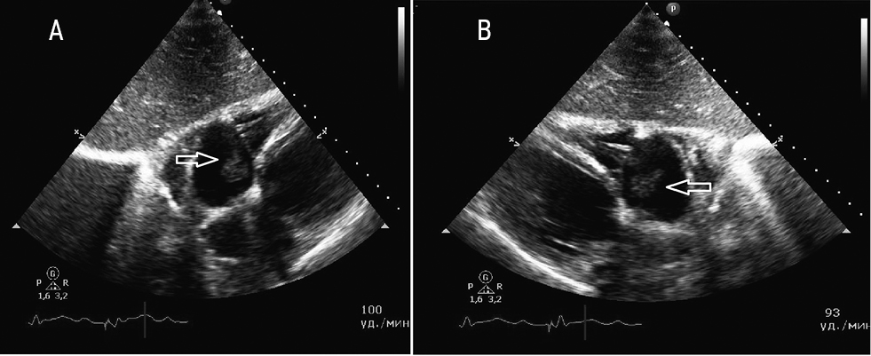 Fig. 3. Echocardiogram of patient A., 04.2019 A — Four-chambered apical section; B — Three-chambered subcostal modified section. The arrows indicate a large loose vegetation located on the electrode near the TV structures.