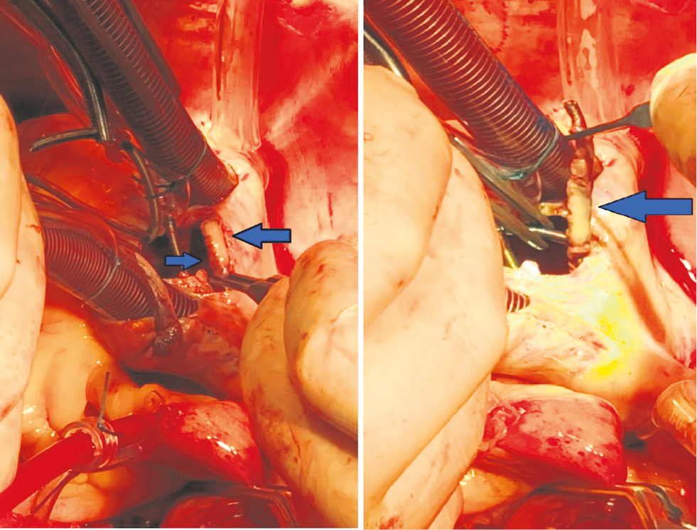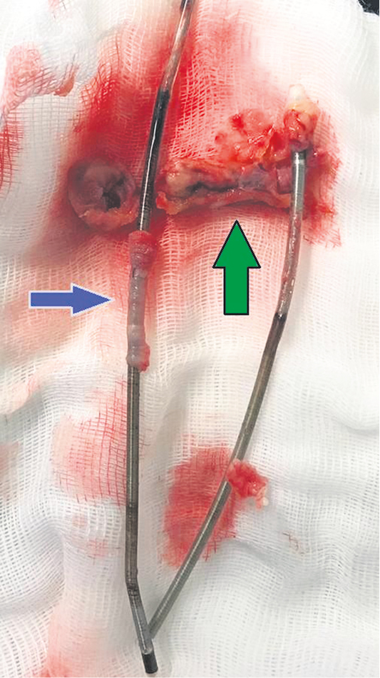 Fig. 7. Intraoperative photographs. Massive vegetation of the “sleeve” type on intracardiac fragments of the electrodes (blue arrows).
