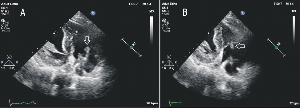 Fig. 5. Echocardiography of patient B. Loose vegetation, fixed on the ventricular electrode near the tricuspid valve. Modified three-chambered apical section: A — Diastole, tricuspid valve open; B — Systole, tricuspid valve closed. Formation is fixed to the electrode; the cusps of the own tricuspid valve appear intact.