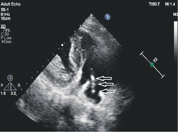 Fig. 6. EchoCG of patient B. Modified 3-chamber apical section. Uneven thickening and echogenicity of the area of the ventricular electrode located above the cusps of the tricuspid valve. This picture was regarded as a probable vegetation of the “sleeve” type.