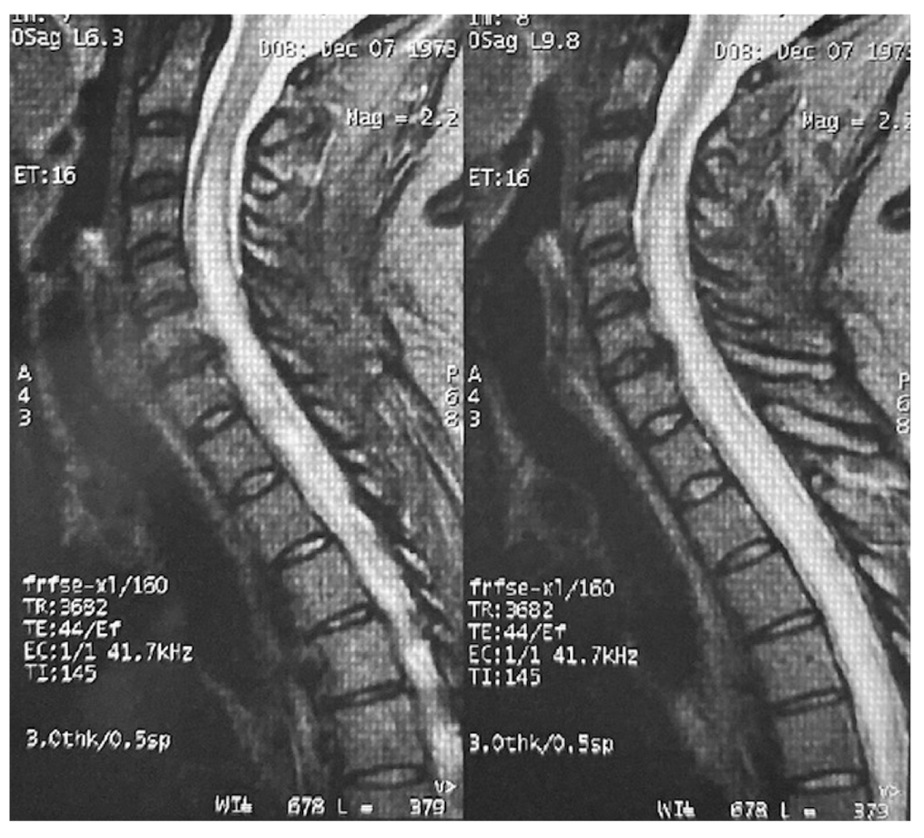 В соматическом статусе без особенностей. В неврологическом статусе выявлена спинальная симптоматика в виде нижней параплегии, проводниковых расстройств чувствительности с грудного уровня, тазовых расстройств в виде задержки мочи, стула. Таким образом, выявленная клиническая картина соответствовала картине поперечного миелита грудного уровня.