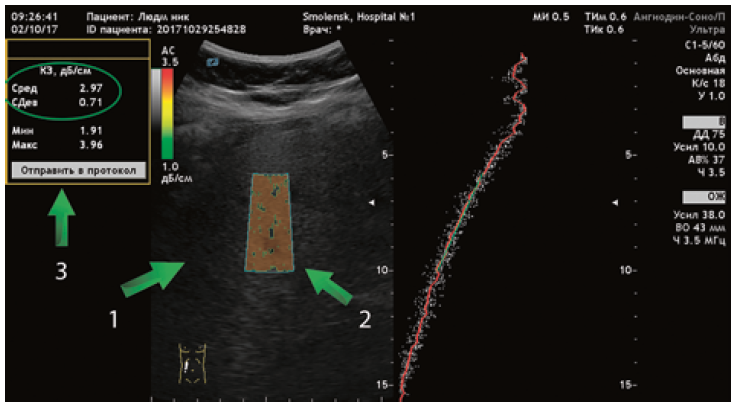 Примечание. 1 — печень, 2 — активная зона измерения, 3 — количественный показатель стеатометрии (коэффициент затухания ультразвуковой волны).