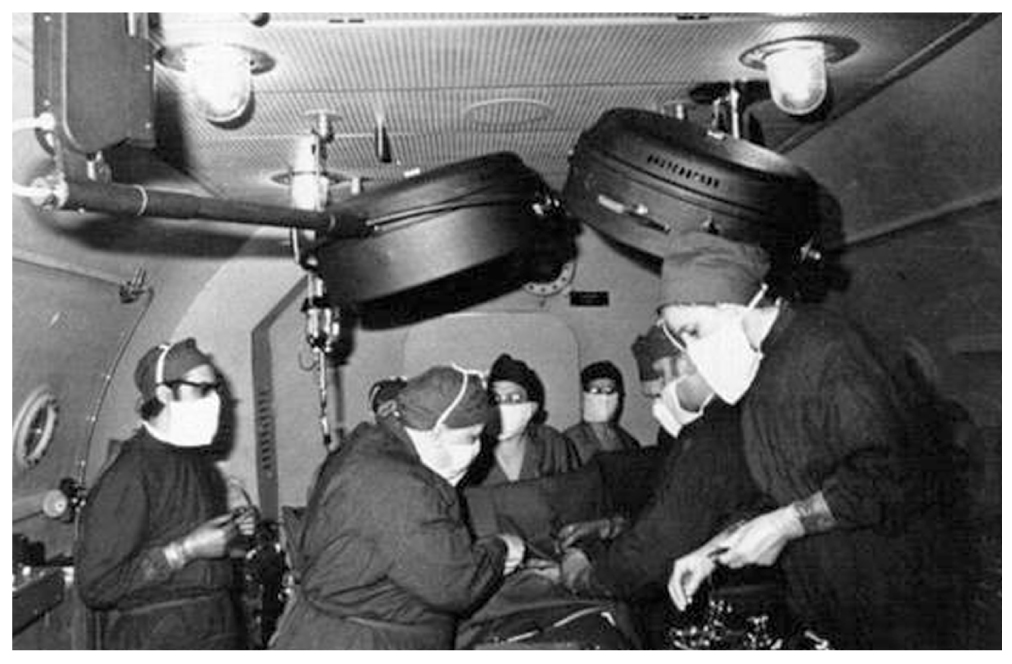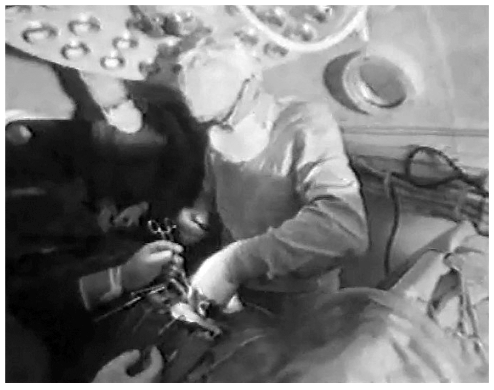 Fig. 1. Operation in the barooperative room of the A.N. Bakulev Institute of Cardiovascular Surgery Academy of Medical Sciences of the USSR (from the archive of A.N. Bakulev National Medical Research Center for Cardiovascular Surgery of the Ministry of Healthcare of the Russian Federation).