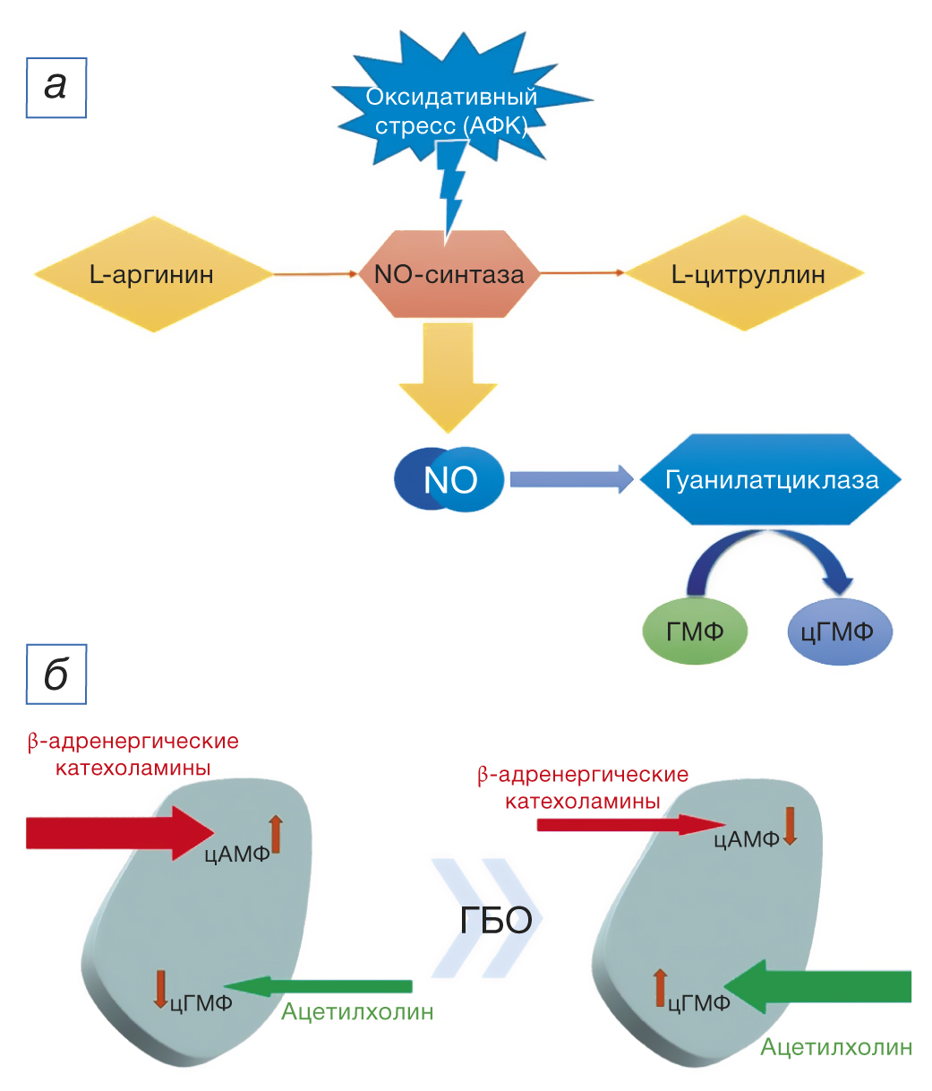 Fig. 5. Scheme of changing ratio of the secondary messengers under the hyperbaric oxygenation: а — NO-synthase activation under oxidative stress; б — сhanging ratio of cAMP и cGMP in a cell. АФК — active oxygen form; ГБО — hyperbaric oxygenation; цАМФ — cyclic adenosine monophosphate; цГМФ — cyclic guanosine monophosphate.