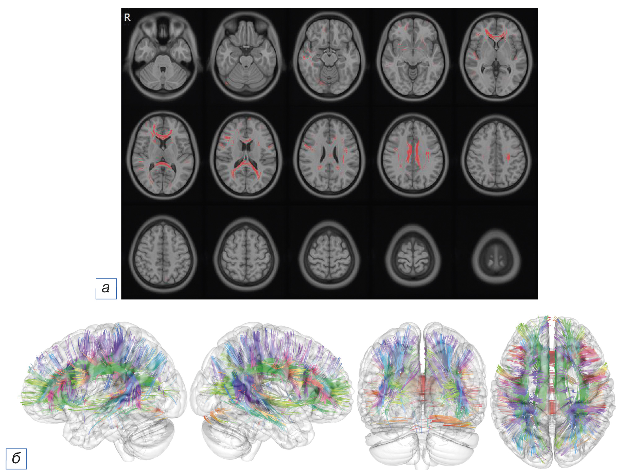 Рис. 1. МР-томограммы (а) и трехмерные реконструкции (б) головного мозга мужчин в различных проекциях с отмеченными проводящими путями, обладающими наибольшим показателем количественной анизотропии (QA). Цветом на панели (б) представлено пространственное направление выявленных трактов. / Fig. 1. MR tomograms (а) and 3D reconstructions (б) of the brain in various projections with the marked pathways, characterized by a higher index of quantitative anisotropy (QA), in men. The spatial direction of the revealed tracts is highlighted in color in panel (б).