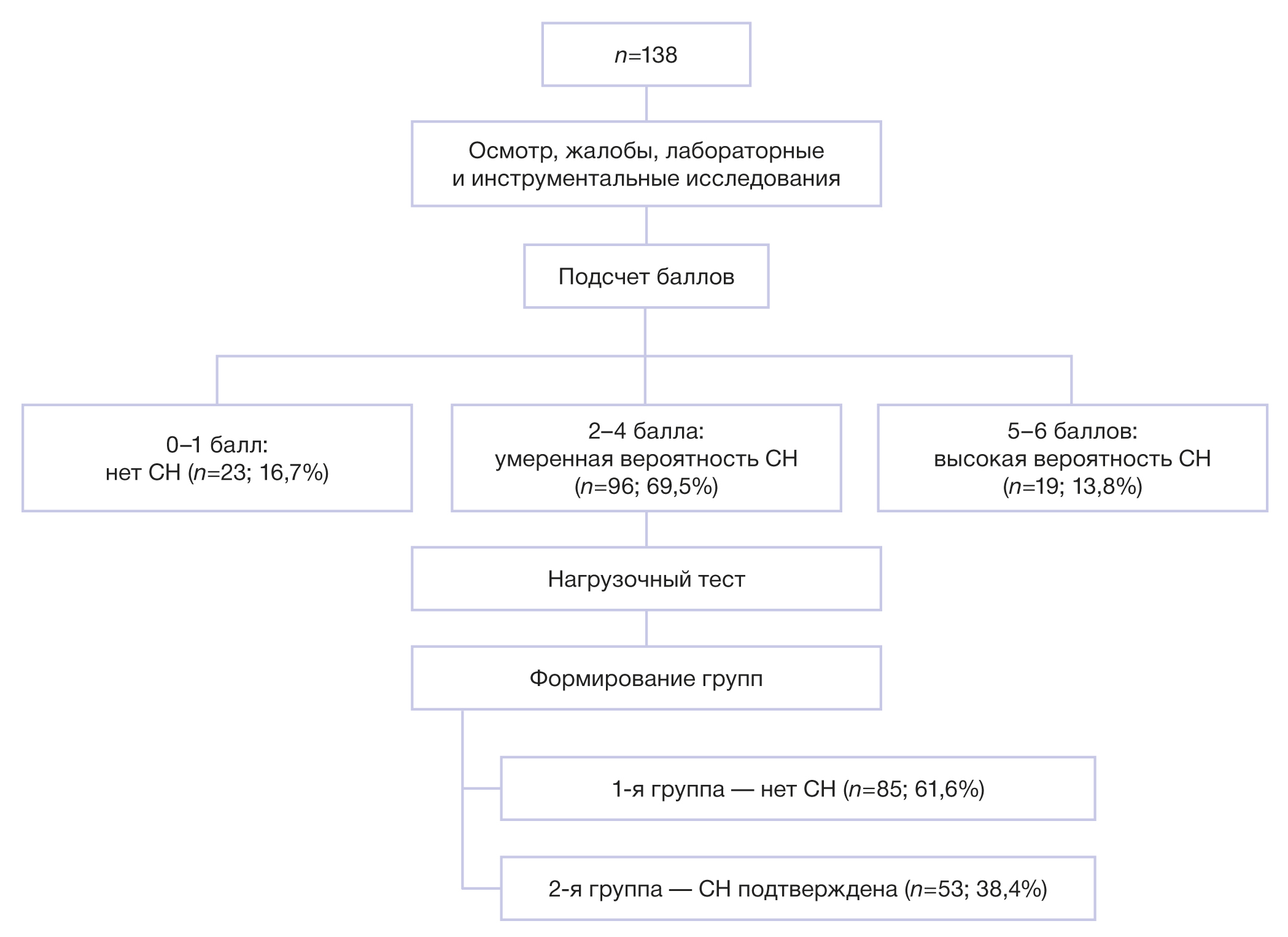 Для решения поставленной задачи в исследование было включено 138 пациентов с ФП, находившихся на лечении в ФНКЦ ФМБА в 2021 году. Необходимо отметить, что большая часть пациентов находились на лечении не в первый раз, имели оперативное вмешательство в анамнезе, выполненное в нашей клинике; проходили неоднократное послеоперационное обследование и мониторинг состояния здоровья. Все пациенты имели установленный диагноз ФП и нормальную фракцию выбoроса левого желудочка. Используя алгоритм HFA-PEFF (Heart Failure Association Pre-test assessment, Echocardiography and natriuretic peptide, Functional testing, Final etiology), все пациенты изначально были разделены на 3 группы: с низкой (n=23), умеренной (n=96) и высокой (n=19) вероятностью СН. Проведение дополнительного нагрузочного теста позволило нам прецизионно оценить пациентов с промежуточным риском (от 2 до 4 баллов) и окончательно сформировать группы: 1-я группа — пациенты без СН — 85 (61,6%); 2-я группа — пациенты с СН и сохранной фракцией выброса — 53 (38,4%) (рис. 1).