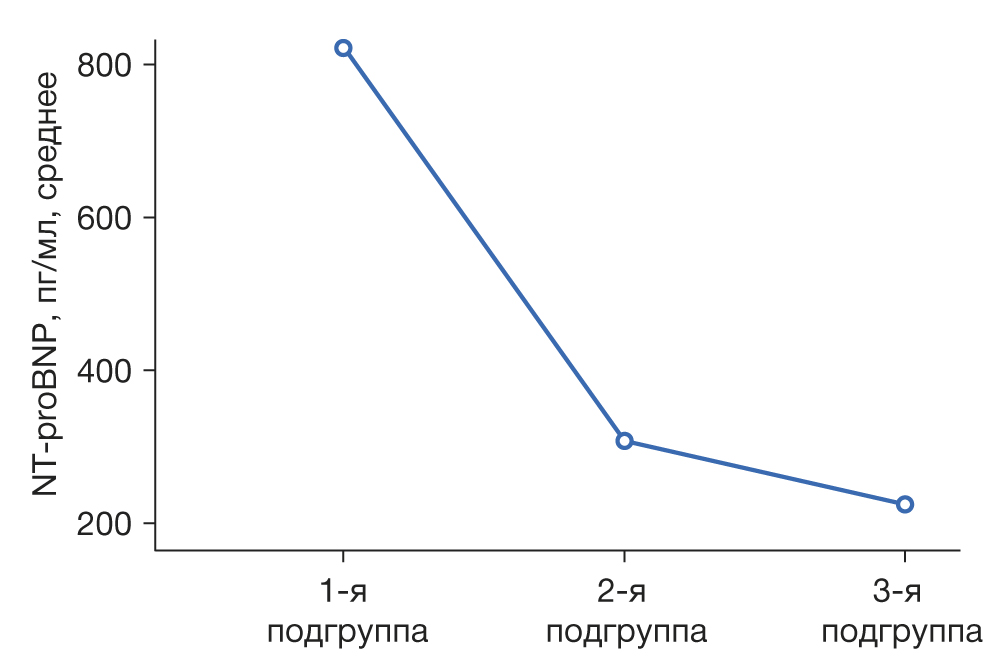 Примечание. * При снижении потребления О2 (в 1-й подгруппе) достоверно повышен уровень NT-proBNP по отношению ко 2-й и 3-й подгруппам. VO2 — потребление кислорода; NT-proBNP — N- концевой фрагмент предшественника мозгового натрийуретического пептида.