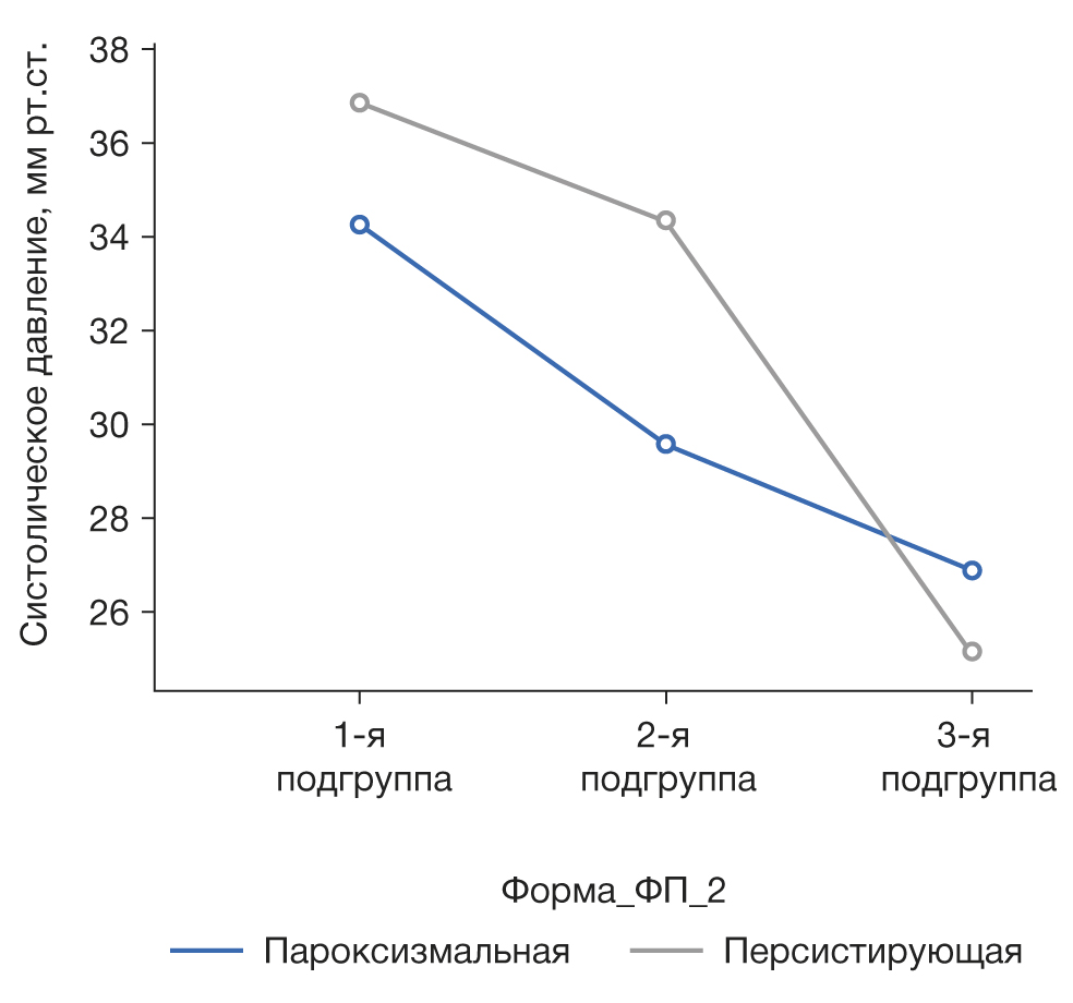 Также дисперсионный анализ продемонстрировал значимую статистическую разницу (p=0,01) в отношении систолического давления в легочной артерии в подгруппах с выраженным и умеренно сниженным потреблением кислорода, и с нормальным пиковым VO2 (табл. 7), при этом в подгруппе со снижением пикового потребления кислорода <17 мл/кг в минуту давление в легочной артерии было достоверно выше как при персистирующей, так и пароксизмальной форме ФП (рис. 3).