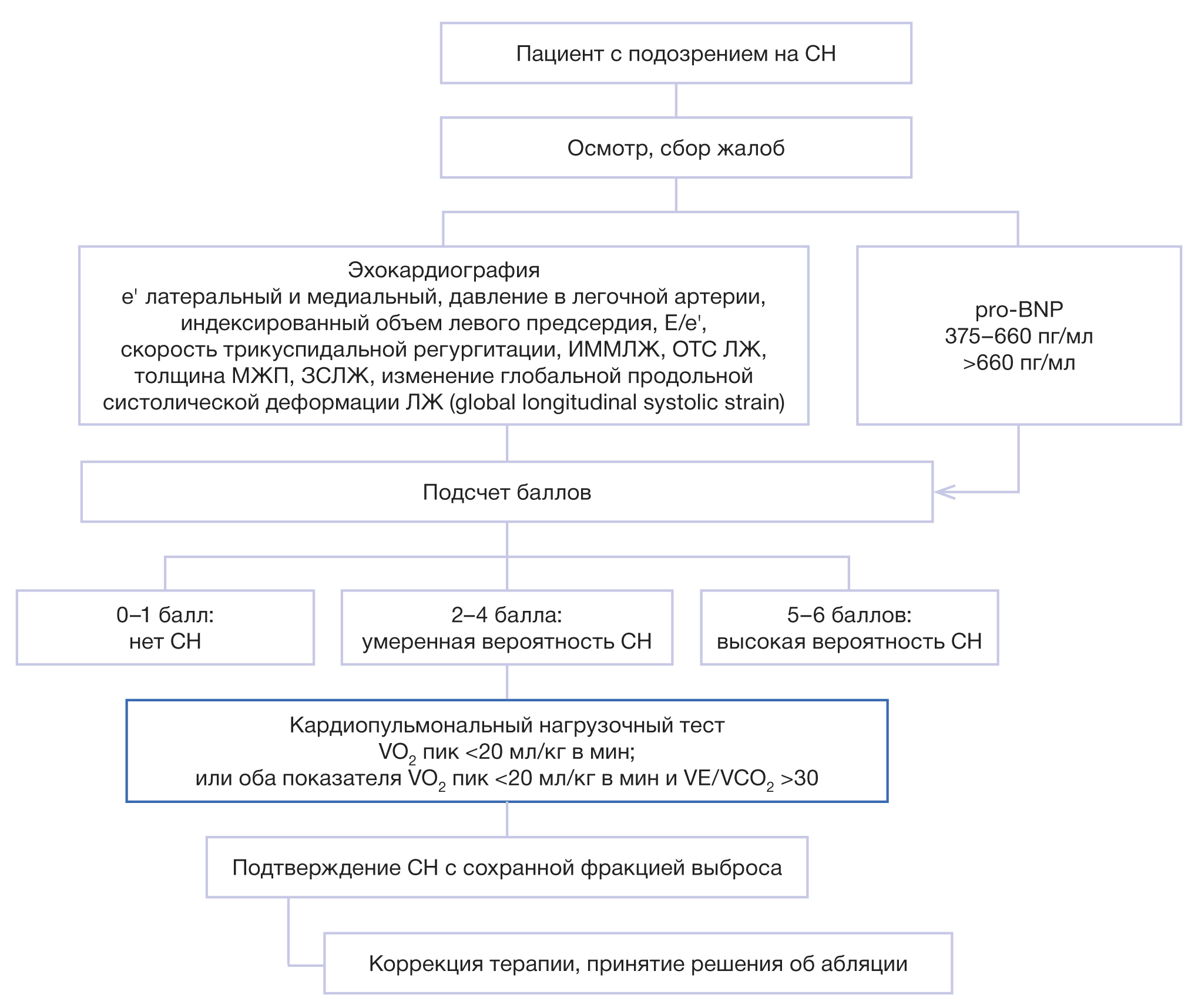 Своевременная и точная диагностика СН с сохранной фракцией выброса является основой эффективного лечения этой категории пациентов. В 2019 году Ассоциацией по сердечной недостаточности Европейского общества кардиологов (HFA/ESC) был предложен алгоритм диагностики СН с сохранной фракцией выброса, в том числе у пациентов с ФП [5].