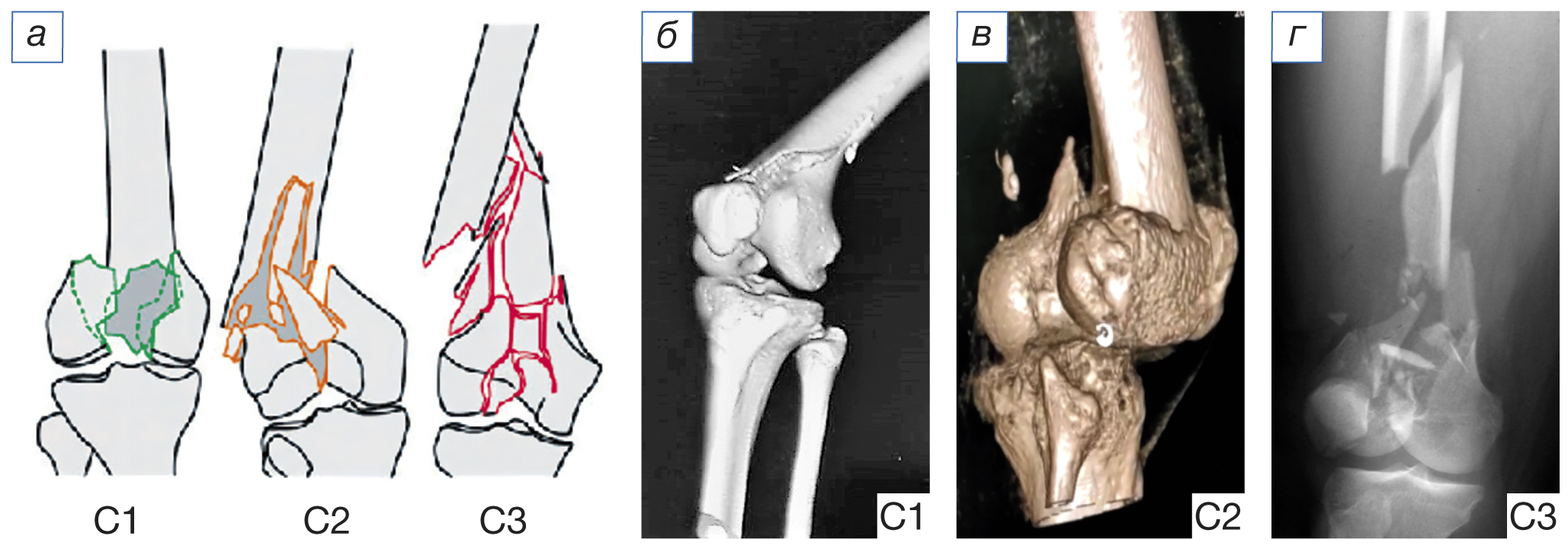 Рис. 1. Классификация переломов костей по АО (Arbeitsgemeinschaft fur osteosynthesenfragen): а — графическое изображение; переломы типа С по классификации АО: б — простой внутрисуставной, простой метафизарный; в — простой внутрисуставной, сложный метафизарный; г — оскольчатый внутрисуставной. / Fig. 1. C-type fractures according to the AO classification (Arbeitsgemeinschaft fur osteosynthesenfragen): а — Grafik; C-type fractures according to AO classification: б — simple intraarticular, simple metaphyseal; в — simple intraarticular, complex metaphyseal; г — comminuted intraarticular.