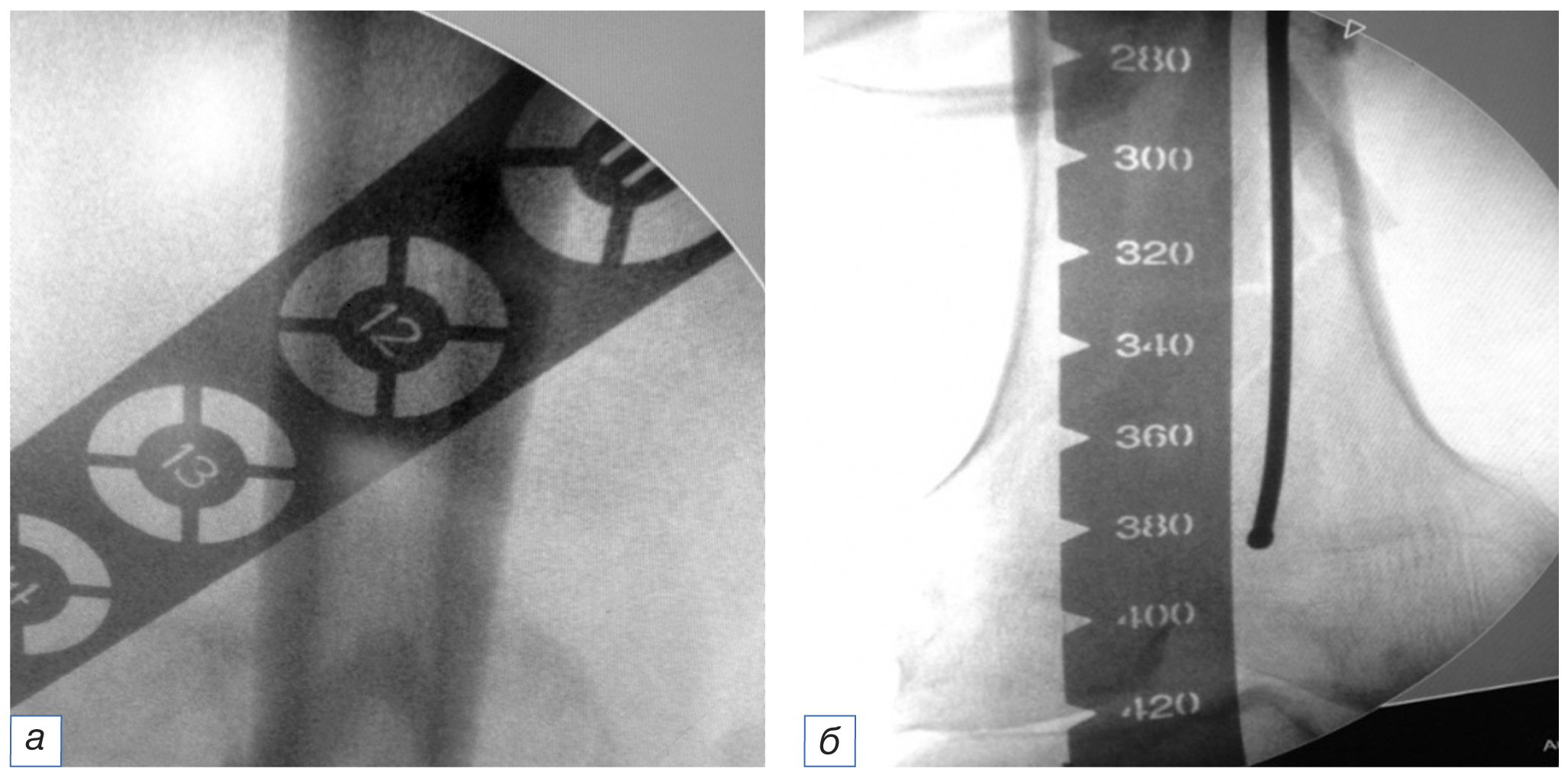 Рис. 2. Определение размеров требуемого фиксатора с помощью шаблонов (а, б). / Fig. 2. Determining the implant size with use of a template (а, б).