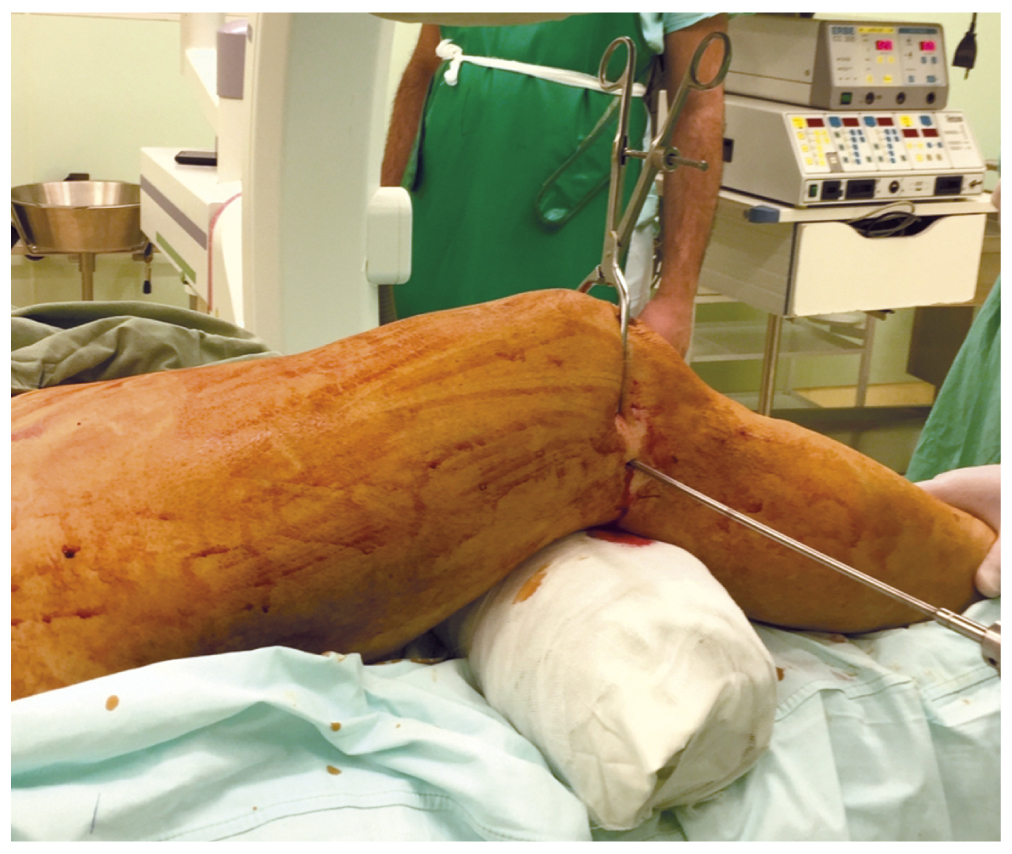 Операции производили под спинальным обезболиванием. Ногу укладывали в согнутом (на 30°) положении коленного сустава на рентгенопрозрачный валик: такая укладка способствует расслаблению мышц задней группы голени и репозиции фрагментов бедра (рис. 3).