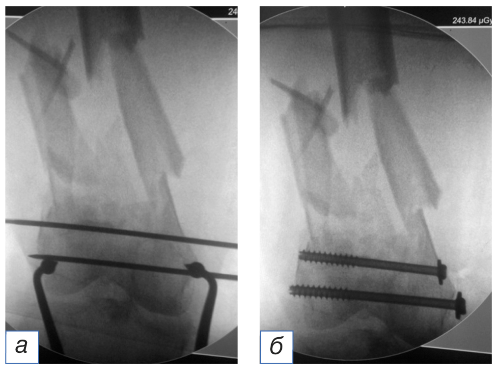 Рис. 4. Этапы фиксации перелома мыщелков бедренной кости стягивающими винтами (а, б). / Fig. 4. Stages of fixation of the femoral condyles fracture with cannulated screws (а, б).