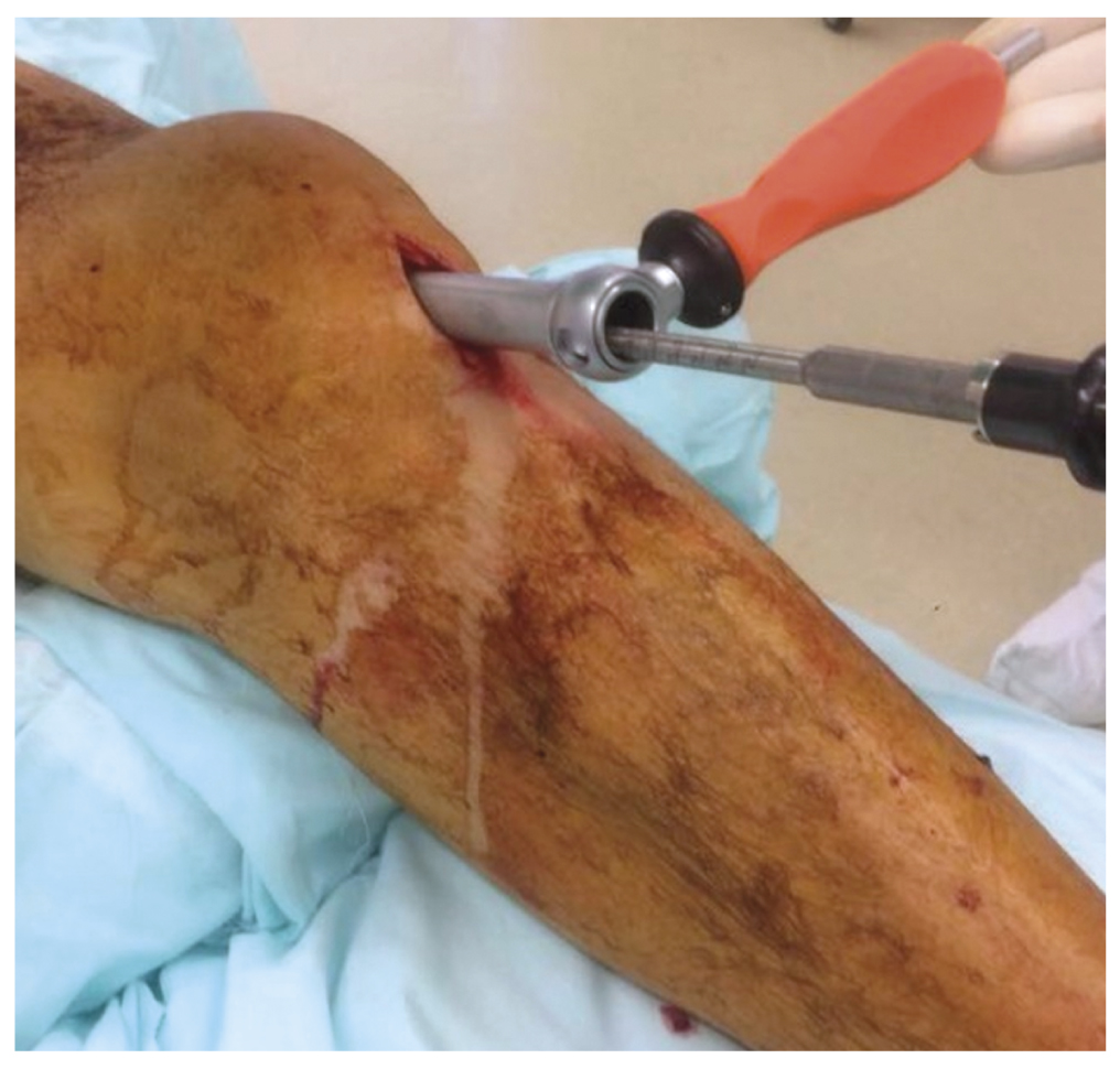 Первым этапом выполняли фиксацию перелома мыщелков стягивающими винтами спереди и сзади от предполагаемой траектории введения штифта после предварительной их репозиции с интраоперационным использованием тазовых щипцов (рис. 4). Из малоинвазивного разреза (до 3 см) сбоку от собственной связки надколенника осуществляли доступ в коленный сустав для проведения направляющей спицы (рис. 5). Затем определяли точку в межмыщелковой ямке, анатомическую ось и траекторию (так называемый угол атаки) для введения ретроградного штифта. Чтобы избежать ятрогенного повреждения крестообразных связок, сначала проводили спицу, ориентируясь на боковом рентгеновском снимке, полученном с помощью электронно-оптического преобразователя, верхнего края линии Blumensaat, а затем выполняли заведение штифта по данной направляющей спице. Все этапы выполнялись под контролем электронно-оптического преобразователя (рис. 6). При правильном введении штифта происходит «саморепозиция» отломков в анатомически правильном отношении, без варусной или вальгусной деформации ДОБК. При необходимости для этого используют поляризующие винты. Дальнейшая хирургическая техника описана в клинических примерах.